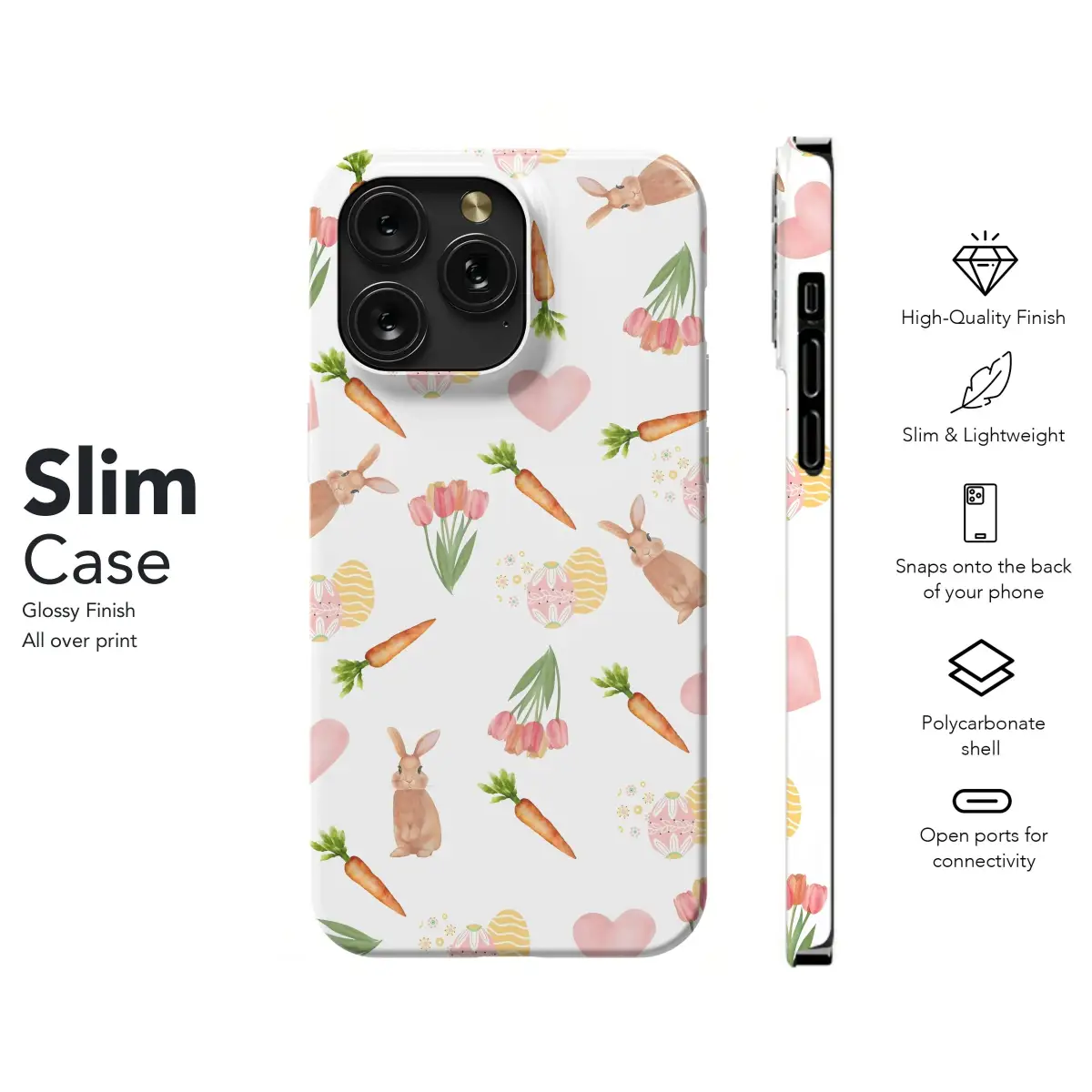 Hop into spring with this adorable Easter Bunny phone case! Featuring a charming design of bunnies, carrots, and tulips, this cover brings a touch of festive cheer to your iPhone, Samsung, or Pixel. Protect your phone in style with this delightful Easter-themed accessory.