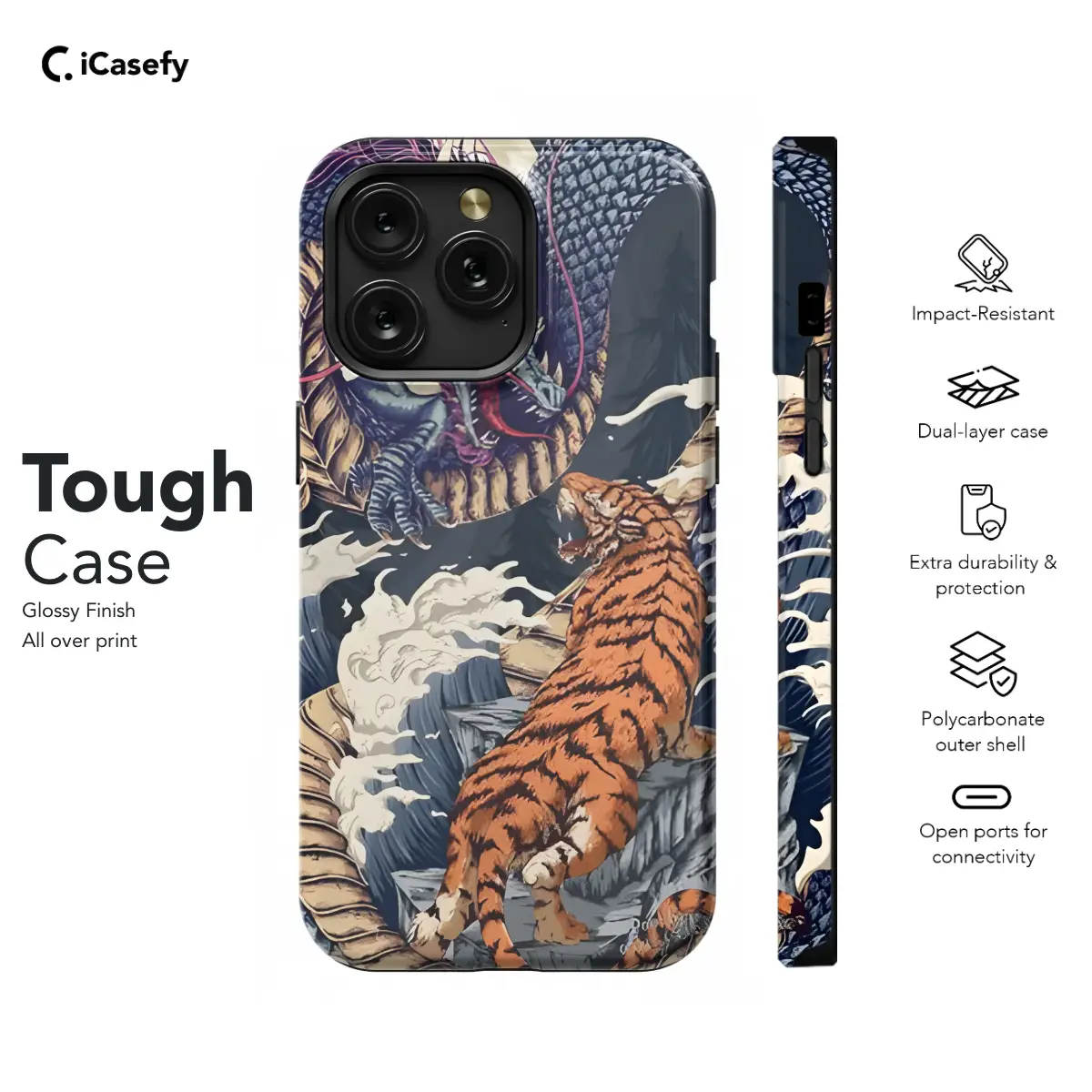 Protect your phone with our exclusive Eastern Chinese Tiger Dragon phone case. This stunning design features a fierce tiger and a majestic dragon, inspired by ancient Chinese mythology. Crafted with durable materials, our case safeguards your device from scratches, drops, and everyday wear and tear. Available for a range of iPhone, Samsung, and Pixel models, this case is the perfect blend of style and protection.