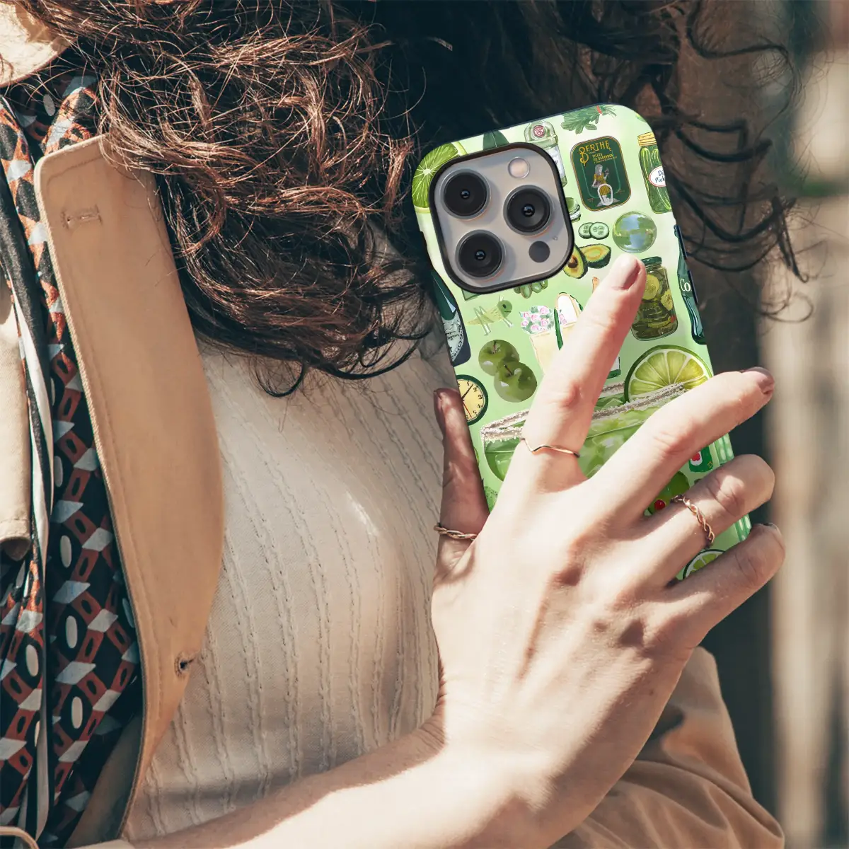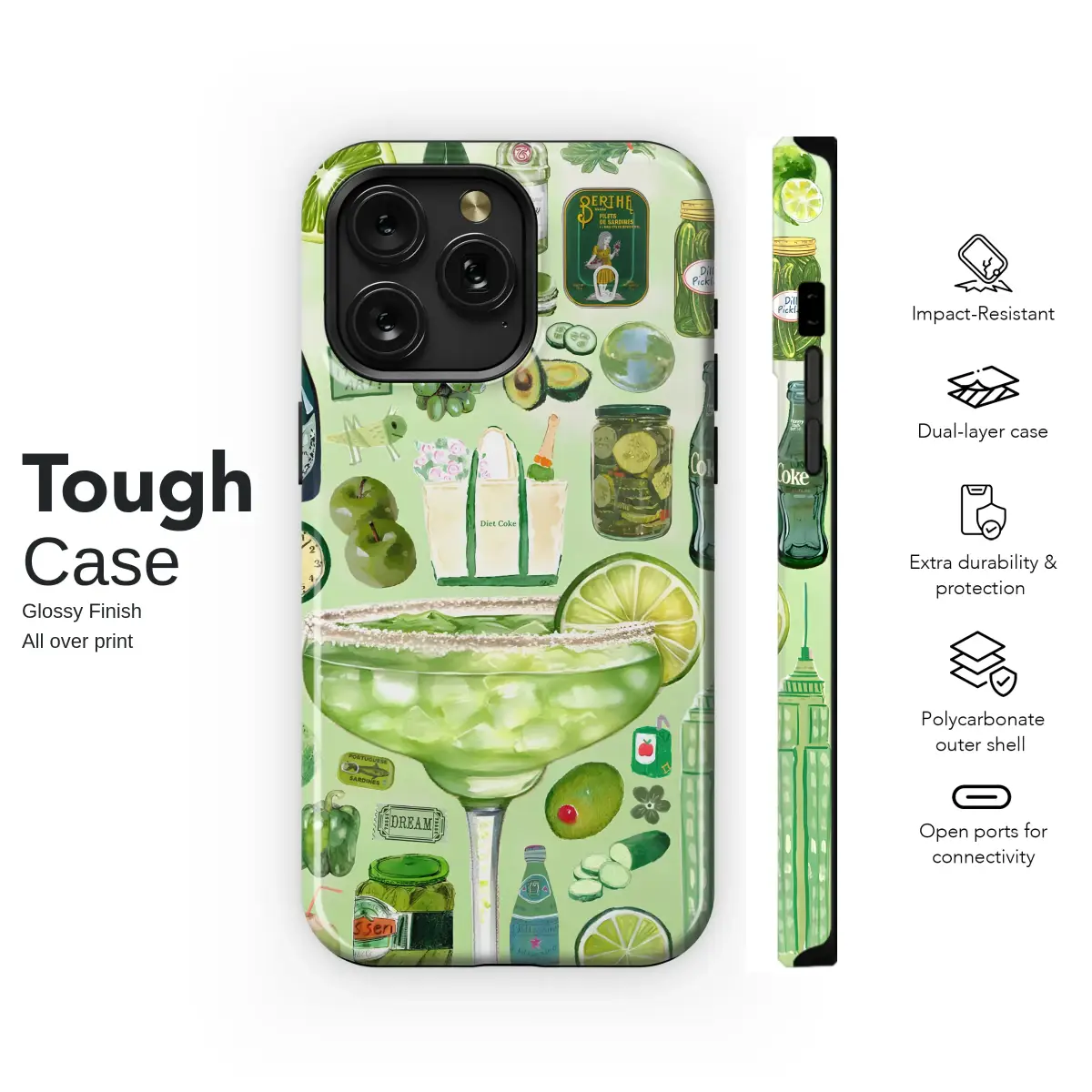 Celebrate a love for all things green with this vibrant and eclectic collage design. The artwork features a stunningly detailed margarita at its center, surrounded by a whimsical collection of green-themed illustrations including zesty limes, crisp pickles, avocados, and champagne. This maximalist, hand-drawn style piece brings a playful and artistic vibe to your favorite accessory, perfect for making a unique statement.