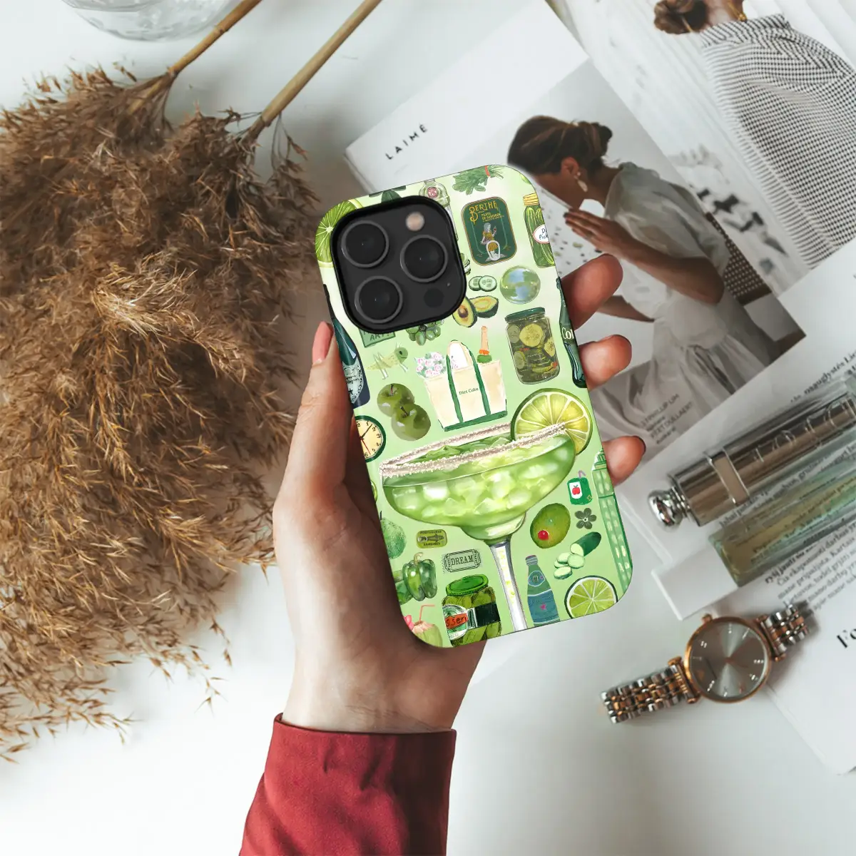 Celebrate a love for all things green with this vibrant and eclectic collage design. The artwork features a stunningly detailed margarita at its center, surrounded by a whimsical collection of green-themed illustrations including zesty limes, crisp pickles, avocados, and champagne. This maximalist, hand-drawn style piece brings a playful and artistic vibe to your favorite accessory, perfect for making a unique statement.