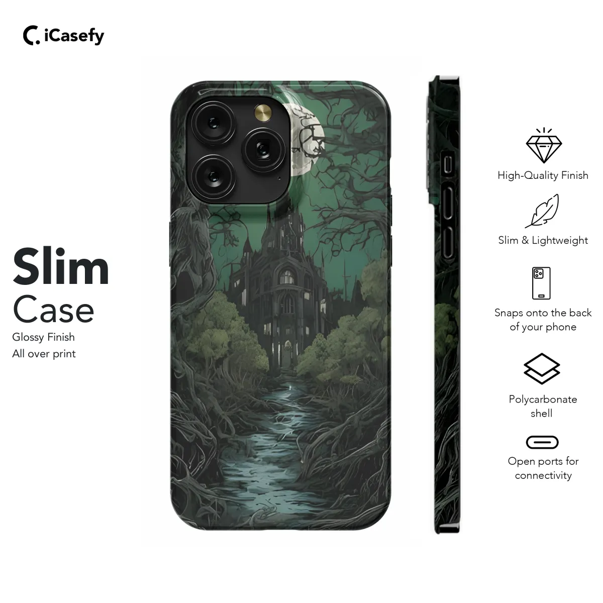 Step into a realm of ethereal darkness with this Eldritch Gothic Castle Phone Case. Inspired by the haunting beauty of a horror night forest, its intricate design transports you to a world of shadows and whispered secrets. Enchanted by a moonlit castle, this phone cover envelops your device in a veil of mystery. Its ethereal trees beckon you to explore the unknown, while the haunting silhouette of the castle adds a touch of spine-tingling intrigue. Embrace the eerie allure of the night with this captivating phone case. Let its enigmatic charm protect your device while it casts a spell on all who behold it.