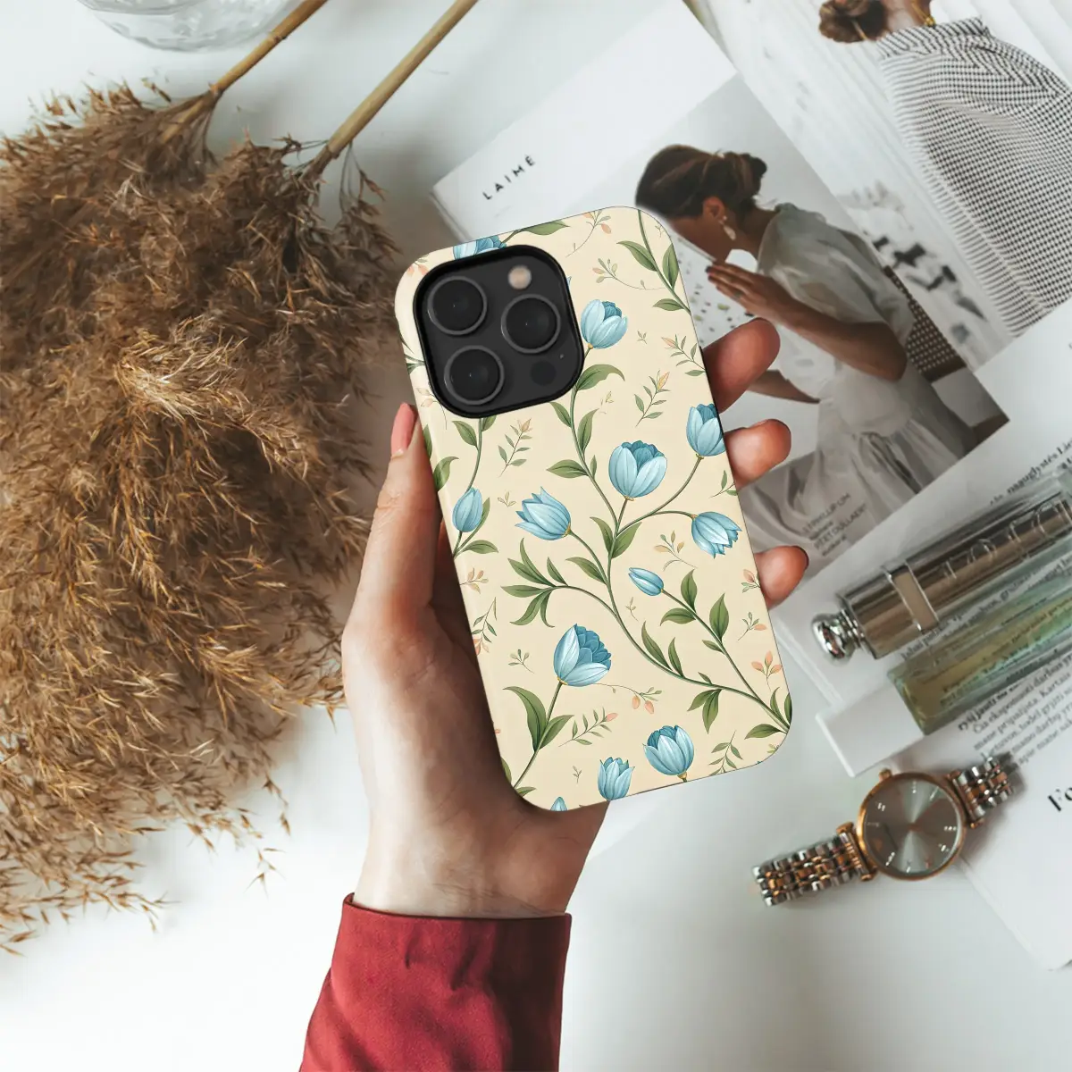 Wrap your everyday essential in the quiet elegance of a vintage botanical garden, a design that whispers tales of sunlit afternoons and secret floral sanctuaries. This enchanting pattern captures a serene moment in nature, where delicate blue tulips gracefully climb and weave on slender stems across a warm, creamy parchment background. Each petal and leaf is rendered with stunning artistic detail, evoking the timeless charm and delicate precision of antique floral illustrations. The soft, dusty blue of the blossoms, ranging from sky to cornflower, pairs beautifully with the lush, deep green of the foliage, creating a harmonious and sophisticated palette that is both calming and utterly captivating. This isn't just a pattern; it's a piece of wearable art that speaks to a love for cottagecore aesthetics, romantic florals, and the simple, enduring beauty of the natural world. Let this exquisite garden accompany you on your daily adventures, transforming your most-used accessory into a unique statement of personal style and refined taste. It’s the perfect, thoughtful gift for the nature lover, the dreamer, or anyone who wishes to carry a little piece of a tranquil, blooming paradise with them wherever they go. Embrace the poetry of the garden and let your style blossom with grace and sophistication.