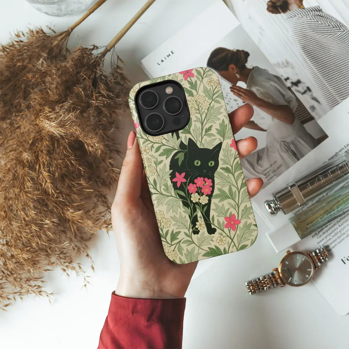 Immerse yourself in the enchanting beauty of this Arts and Crafts inspired botanical design, a perfect blend of classic artistry and modern whimsy. This captivating pattern features a sly black cat peeking from within a lush, flowing tapestry of green leaves and delicate floral clusters. Echoing the intricate elegance of William Morris style, the design is adorned with charming white blossoms accented with golden centers and vibrant pink flowers, creating a harmonious visual rhythm. The hidden feline friend adds a touch of playful intrigue, making this piece a delightful surprise for cat enthusiasts and art lovers alike. Each element, from the gracefully intertwining vines to the expressive green eyes of the cat, is rendered with meticulous detail, bringing a sense of depth and natural vitality to the print. This versatile artwork is ideal for adding a touch of vintage charm and unique personality to your favorite everyday items. Perfect for those who appreciate botanical aesthetics, animal motifs, and the timeless appeal of heritage design, this print offers a unique way to carry a piece of exquisite art with you. Enhance your accessories with this beautiful illustration that captures the quiet magic of a secret garden and its mysterious inhabitant. This aesthetic print is more than just a design; it's a statement piece that brings artistic flair and a love for nature and felines into your daily life, making it a truly special gift or personal treat.
