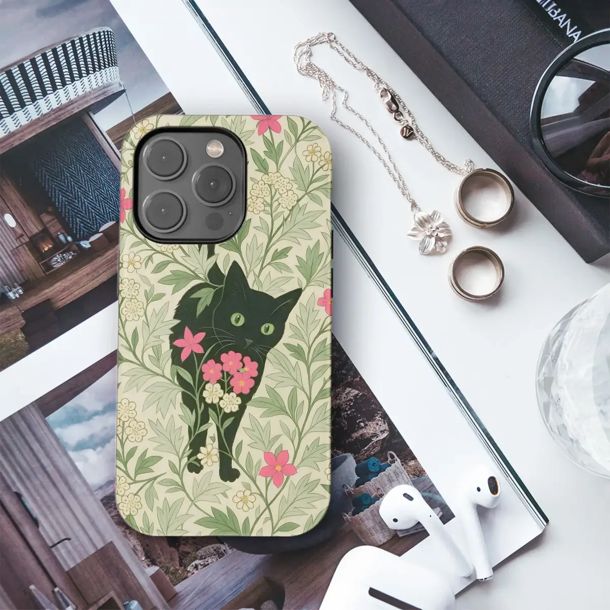 Immerse yourself in the enchanting beauty of this Arts and Crafts inspired botanical design, a perfect blend of classic artistry and modern whimsy. This captivating pattern features a sly black cat peeking from within a lush, flowing tapestry of green leaves and delicate floral clusters. Echoing the intricate elegance of William Morris style, the design is adorned with charming white blossoms accented with golden centers and vibrant pink flowers, creating a harmonious visual rhythm. The hidden feline friend adds a touch of playful intrigue, making this piece a delightful surprise for cat enthusiasts and art lovers alike. Each element, from the gracefully intertwining vines to the expressive green eyes of the cat, is rendered with meticulous detail, bringing a sense of depth and natural vitality to the print. This versatile artwork is ideal for adding a touch of vintage charm and unique personality to your favorite everyday items. Perfect for those who appreciate botanical aesthetics, animal motifs, and the timeless appeal of heritage design, this print offers a unique way to carry a piece of exquisite art with you. Enhance your accessories with this beautiful illustration that captures the quiet magic of a secret garden and its mysterious inhabitant. This aesthetic print is more than just a design; it's a statement piece that brings artistic flair and a love for nature and felines into your daily life, making it a truly special gift or personal treat.