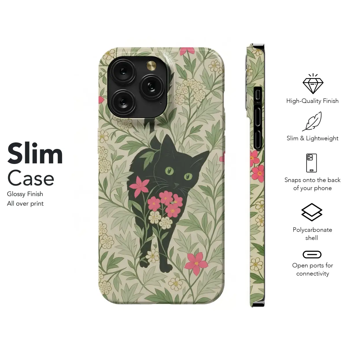 Immerse yourself in the enchanting beauty of this Arts and Crafts inspired botanical design, a perfect blend of classic artistry and modern whimsy. This captivating pattern features a sly black cat peeking from within a lush, flowing tapestry of green leaves and delicate floral clusters. Echoing the intricate elegance of William Morris style, the design is adorned with charming white blossoms accented with golden centers and vibrant pink flowers, creating a harmonious visual rhythm. The hidden feline friend adds a touch of playful intrigue, making this piece a delightful surprise for cat enthusiasts and art lovers alike. Each element, from the gracefully intertwining vines to the expressive green eyes of the cat, is rendered with meticulous detail, bringing a sense of depth and natural vitality to the print. This versatile artwork is ideal for adding a touch of vintage charm and unique personality to your favorite everyday items. Perfect for those who appreciate botanical aesthetics, animal motifs, and the timeless appeal of heritage design, this print offers a unique way to carry a piece of exquisite art with you. Enhance your accessories with this beautiful illustration that captures the quiet magic of a secret garden and its mysterious inhabitant. This aesthetic print is more than just a design; it's a statement piece that brings artistic flair and a love for nature and felines into your daily life, making it a truly special gift or personal treat.