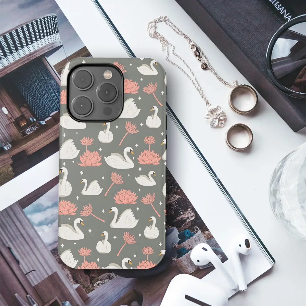 Immerse yourself in tranquility with this enchanting aquatic ballet design, perfect for adding a touch of unique charm to your most essential personal item. This exquisite, seamless pattern showcases graceful white swans gliding amongst vibrant pink lotus flowers, all set against a deep, calming grey backdrop accented with delicate sparkling stars. Each detail is rendered with artistic care, creating a sense of peaceful elegance and natural beauty that transforms the ordinary into something truly special. It's an ideal way to express your personal aesthetic, offering a dreamy, nature-inspired look that is both sophisticated and serene. Let this captivating print reflect your individuality, making your everyday carry a canvas for graceful art. Whether seeking a distinctive accessory for yourself or searching for a thoughtful gift for someone who appreciates elegant design and artistic flair, this unique illustration is sure to delight. The delicate balance of wildlife and floral elements captures a sense of calm and wonder, making it a statement piece that is both beautiful and meaningful. Elevate your style with this charming pattern, designed to bring joy and aesthetic appeal to your cherished belongings. This enchanting scene of swans and lotuses is more than just a design; it's a little piece of peaceful paradise you can carry with you, adding a splash of serene beauty to your day. Discover the perfect blend of nature, elegance, and personalization with this captivating artistic pattern.