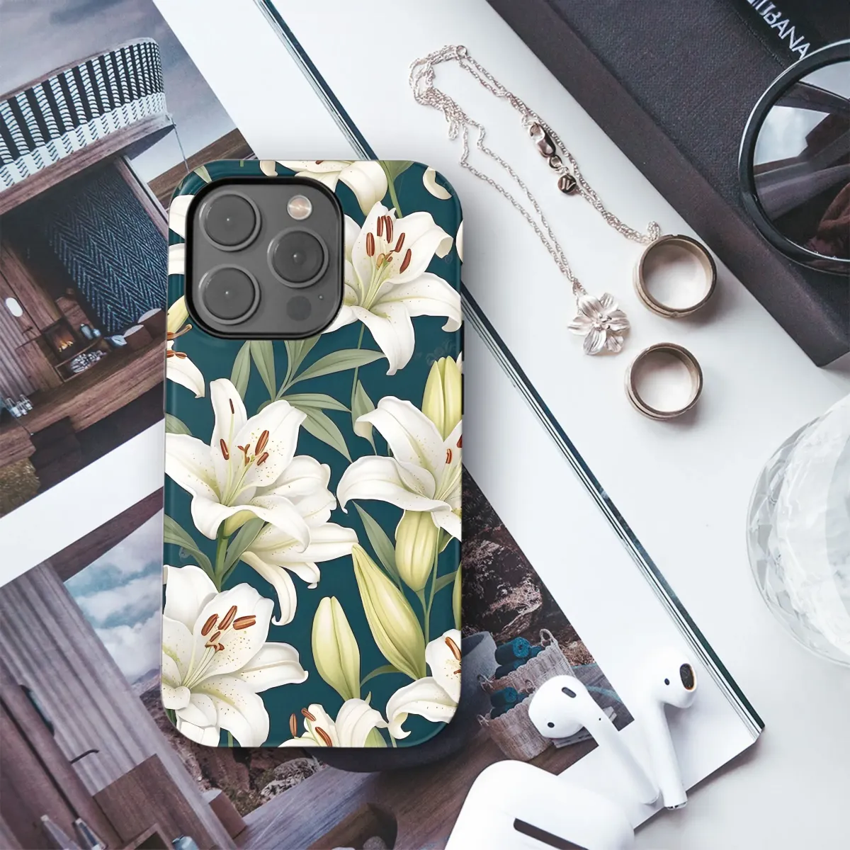 Elevate your everyday aesthetic with this stunning white lily floral pattern, a design that radiates timeless elegance and natural beauty. Set against a deep, dark background, the luminous white lily blossoms stand out dramatically, creating a visually striking and sophisticated look. This detailed botanical print features a luxurious, seamless arrangement of lush lilies and verdant foliage, captured with exquisite precision. Delicate petals, intricate stamens, and rich green leaves are rendered beautifully, bringing a sense of tranquility and artistic flair to the design. This pattern is perfect for those who appreciate sophisticated floral art and wish to carry a piece of nature's serene beauty with them. It transforms a common item into a unique statement accessory, reflecting personal style and a love for botanical elegance. Ideal as a thoughtful gift for floral enthusiasts or a personal indulgence, this high-quality print ensures vibrant colors and fine details are preserved, adding a layer of durable aesthetic appeal. It's a stylish way to adorn your cherished item, offering both refined beauty and a sense of protection for something you use daily. This elegant floral pattern is a beautiful expression of style, perfect for anyone seeking unique, nature-inspired accessories with a touch of luxury and botanical charm.