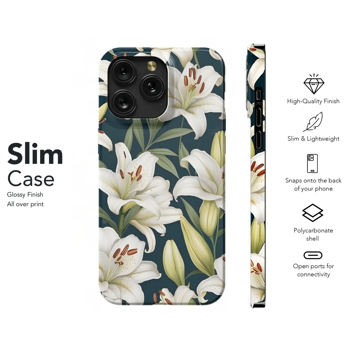 Elevate your everyday aesthetic with this stunning white lily floral pattern, a design that radiates timeless elegance and natural beauty. Set against a deep, dark background, the luminous white lily blossoms stand out dramatically, creating a visually striking and sophisticated look. This detailed botanical print features a luxurious, seamless arrangement of lush lilies and verdant foliage, captured with exquisite precision. Delicate petals, intricate stamens, and rich green leaves are rendered beautifully, bringing a sense of tranquility and artistic flair to the design. This pattern is perfect for those who appreciate sophisticated floral art and wish to carry a piece of nature's serene beauty with them. It transforms a common item into a unique statement accessory, reflecting personal style and a love for botanical elegance. Ideal as a thoughtful gift for floral enthusiasts or a personal indulgence, this high-quality print ensures vibrant colors and fine details are preserved, adding a layer of durable aesthetic appeal. It's a stylish way to adorn your cherished item, offering both refined beauty and a sense of protection for something you use daily. This elegant floral pattern is a beautiful expression of style, perfect for anyone seeking unique, nature-inspired accessories with a touch of luxury and botanical charm.