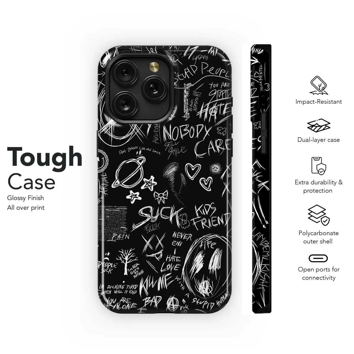 This edgy, monochrome design features a chaotic yet captivating blend of hand-drawn graffiti and symbolic imagery. Bold white lettering against a stark black background creates a striking contrast, showcasing phrases that express raw emotion and rebellious spirit. From declarations of love and hate to cynical observations and existential musings, the artwork evokes a sense of youthful angst and nonconformity. The intricate details, including symbols like peace signs and planets, alongside abstract scribbles and text fragments, contribute to a visually dynamic and thought-provoking composition. This design is perfect for individuals who appreciate bold statements and unique aesthetics, making a powerful statement of personal style. The high-resolution print ensures vibrant and long-lasting results. Express yourself with this edgy, attention-grabbing piece that stands out from the crowd. A truly individualistic accessory for those who dare to be different.