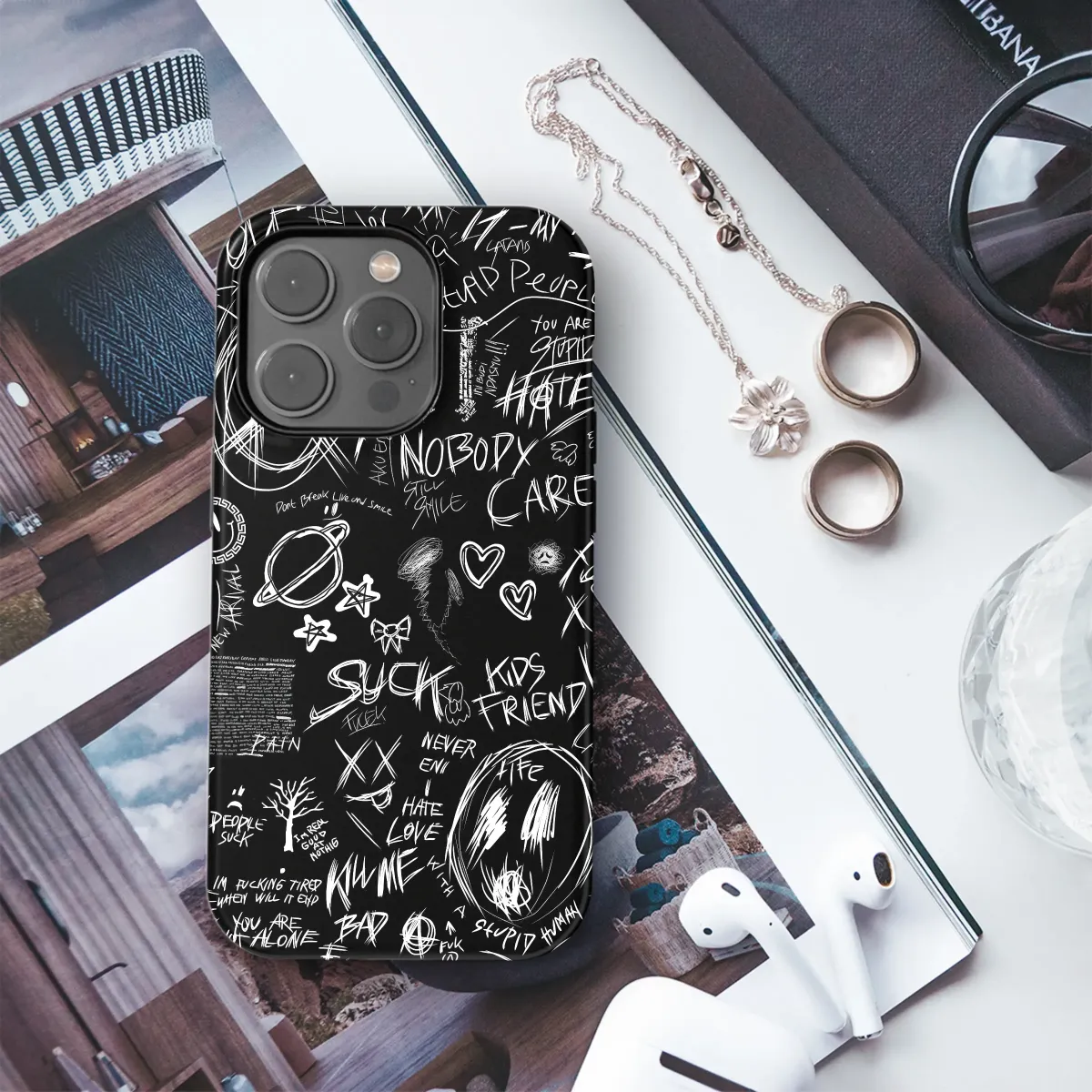 This edgy, monochrome design features a chaotic yet captivating blend of hand-drawn graffiti and symbolic imagery. Bold white lettering against a stark black background creates a striking contrast, showcasing phrases that express raw emotion and rebellious spirit. From declarations of love and hate to cynical observations and existential musings, the artwork evokes a sense of youthful angst and nonconformity. The intricate details, including symbols like peace signs and planets, alongside abstract scribbles and text fragments, contribute to a visually dynamic and thought-provoking composition. This design is perfect for individuals who appreciate bold statements and unique aesthetics, making a powerful statement of personal style. The high-resolution print ensures vibrant and long-lasting results. Express yourself with this edgy, attention-grabbing piece that stands out from the crowd. A truly individualistic accessory for those who dare to be different.