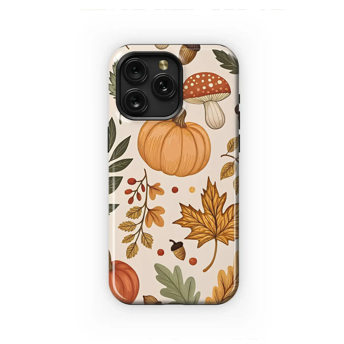 Embrace the enchanting spirit of the harvest season with this beautifully illustrated botanical design. Every glance will transport you to a crisp autumn day, crunching through a sun-dappled forest floor. This delightful pattern features a charming scatter of plump, orange pumpkins, whimsical red-capped mushrooms, and tiny, detailed acorns, all nestled among a variety of fall foliage. Golden maple leaves, rustic oak sprigs, and delicate sage green branches dance across a warm cream background, creating a sense of cozy nostalgia and woodland wonder. The vintage-inspired, hand-drawn style gives this artwork a timeless, artisanal quality, perfect for anyone who adores the cottagecore aesthetic and the simple joys of nature. Let this design be your daily reminder of warm sweaters, pumpkin spice lattes, and the serene beauty of the changing seasons. It’s more than just a pattern; it’s an invitation to carry the magic of autumn with you, transforming an everyday essential into a unique piece of seasonal art that celebrates nature's most colorful display.
