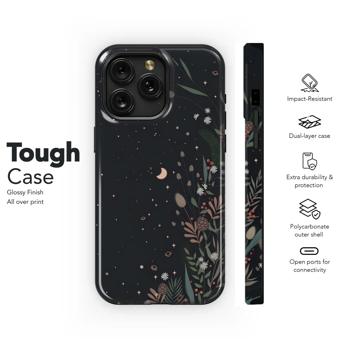 Wander into a secret midnight garden where the earthly meets the celestial with this enchanting botanical design. This magical illustration captures a whimsical forest floor under a vast, starry expanse, creating a stunning piece of art for your everyday essential. Two delicate crescent moons glow softly amidst a sprinkle of tiny planets and twinkling constellations, casting a serene light upon a lush botanical arrangement. Discover intricately detailed pinecones, verdant fern leaves, wild grasses, and clusters of vibrant red winter berries, all nestled together with charming wildflowers against a deep night-sky backdrop. This design is perfect for anyone who loves the cottagecore aesthetic, embraces a witchy vibe, or carries a bohemian spirit. The captivating dark floral artwork blends the wonder of the cosmos with the rustic charm of a woodland escape, making it a unique accessory with a dark academia feel. Adorn your favorite device with this slice of magic and carry a pocketful of starlight and nature's whispers wherever you go. It’s a truly unforgettable gift for the dreamer, stargazer, or nature lover in your life, perfect for adding a touch of mystical elegance to their daily routine.