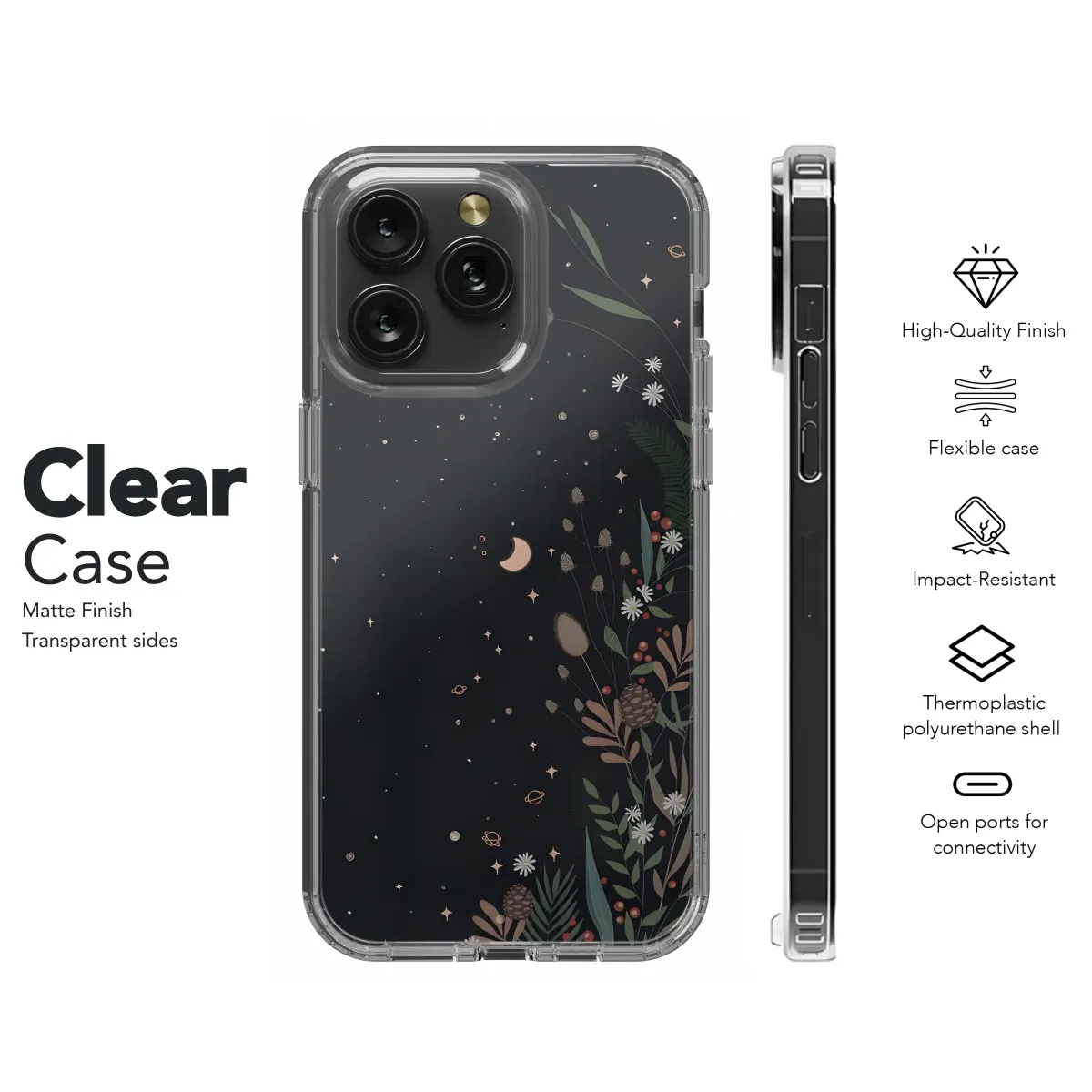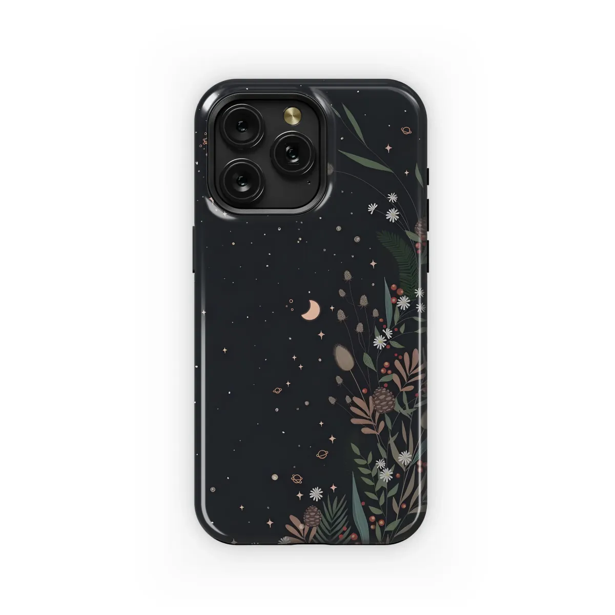 Wander into a secret midnight garden where the earthly meets the celestial with this enchanting botanical design. This magical illustration captures a whimsical forest floor under a vast, starry expanse, creating a stunning piece of art for your everyday essential. Two delicate crescent moons glow softly amidst a sprinkle of tiny planets and twinkling constellations, casting a serene light upon a lush botanical arrangement. Discover intricately detailed pinecones, verdant fern leaves, wild grasses, and clusters of vibrant red winter berries, all nestled together with charming wildflowers against a deep night-sky backdrop. This design is perfect for anyone who loves the cottagecore aesthetic, embraces a witchy vibe, or carries a bohemian spirit. The captivating dark floral artwork blends the wonder of the cosmos with the rustic charm of a woodland escape, making it a unique accessory with a dark academia feel. Adorn your favorite device with this slice of magic and carry a pocketful of starlight and nature's whispers wherever you go. It’s a truly unforgettable gift for the dreamer, stargazer, or nature lover in your life, perfect for adding a touch of mystical elegance to their daily routine.