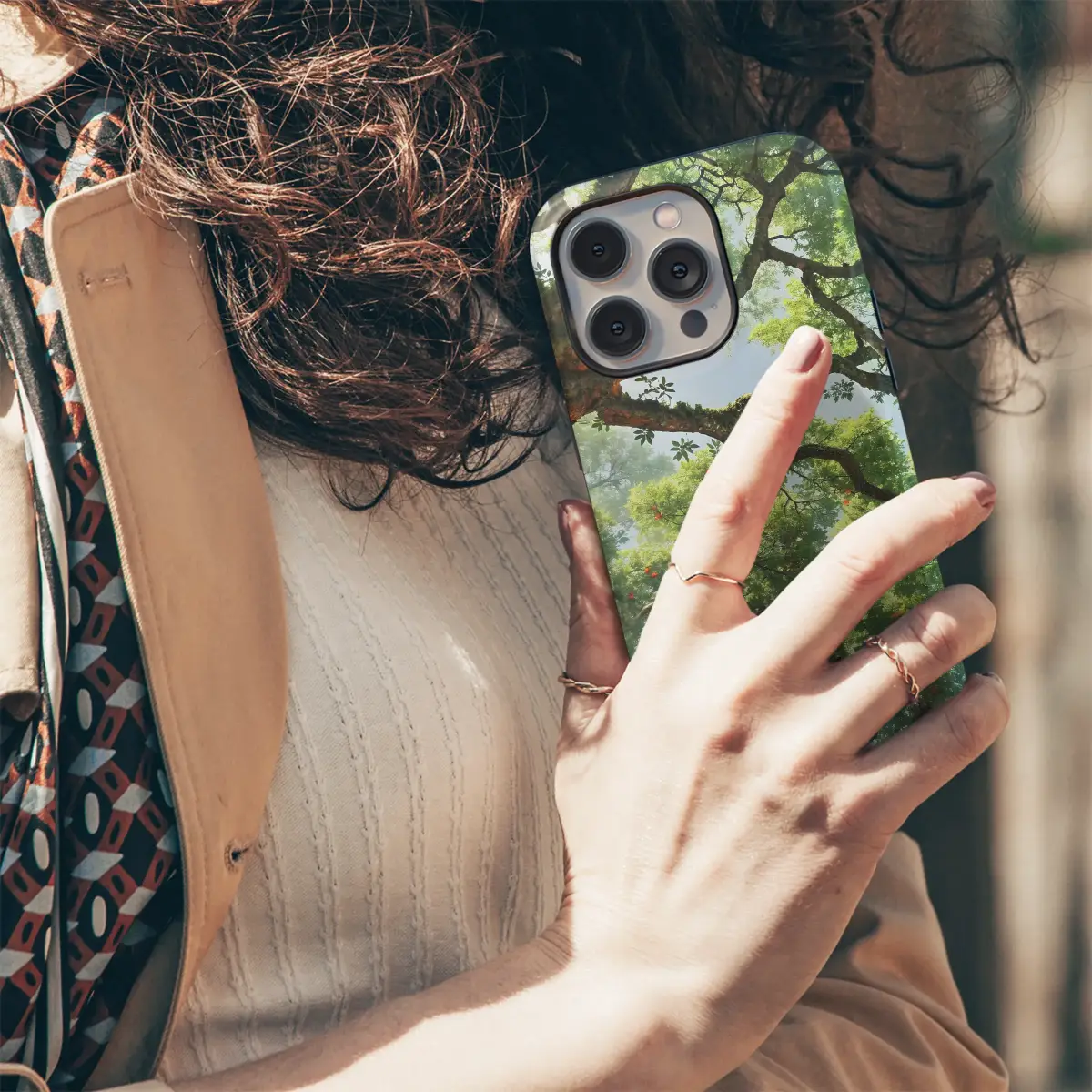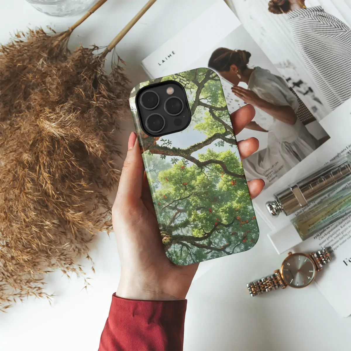 Immerse yourself in the tranquility of an enchanted forest with this breathtaking design. The artwork features a view looking up through the gnarled, mossy branches of an ancient tree, where vibrant green leaves create a lush canopy. Dappled sunlight filters through the foliage, highlighting clusters of bright orange fruit and creating a dreamy, ethereal atmosphere. This painterly nature scene captures a moment of serene, woodland beauty.