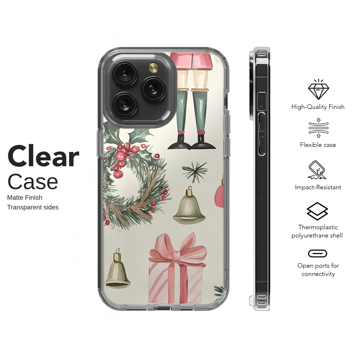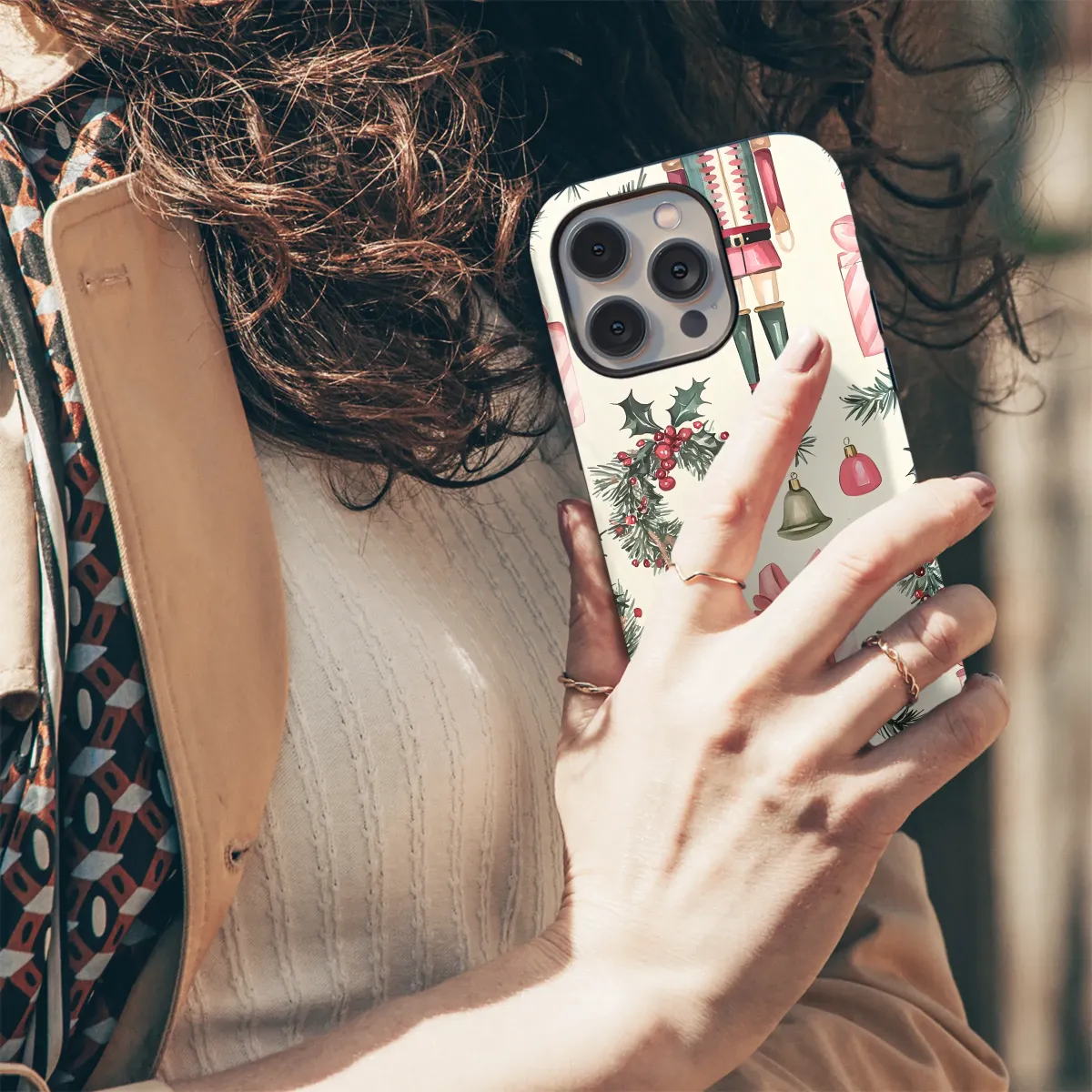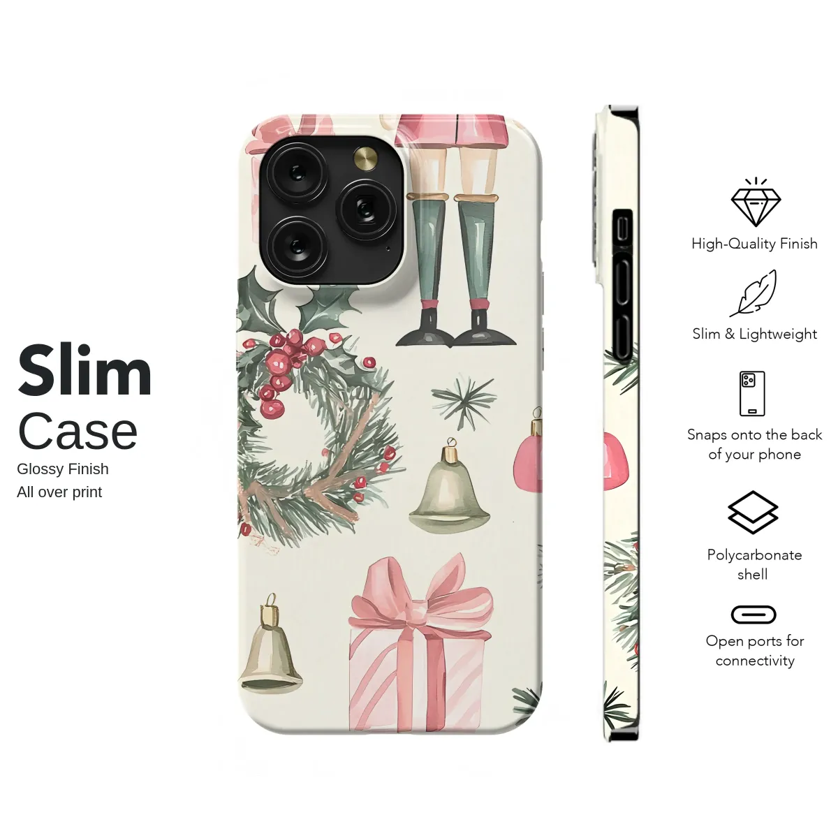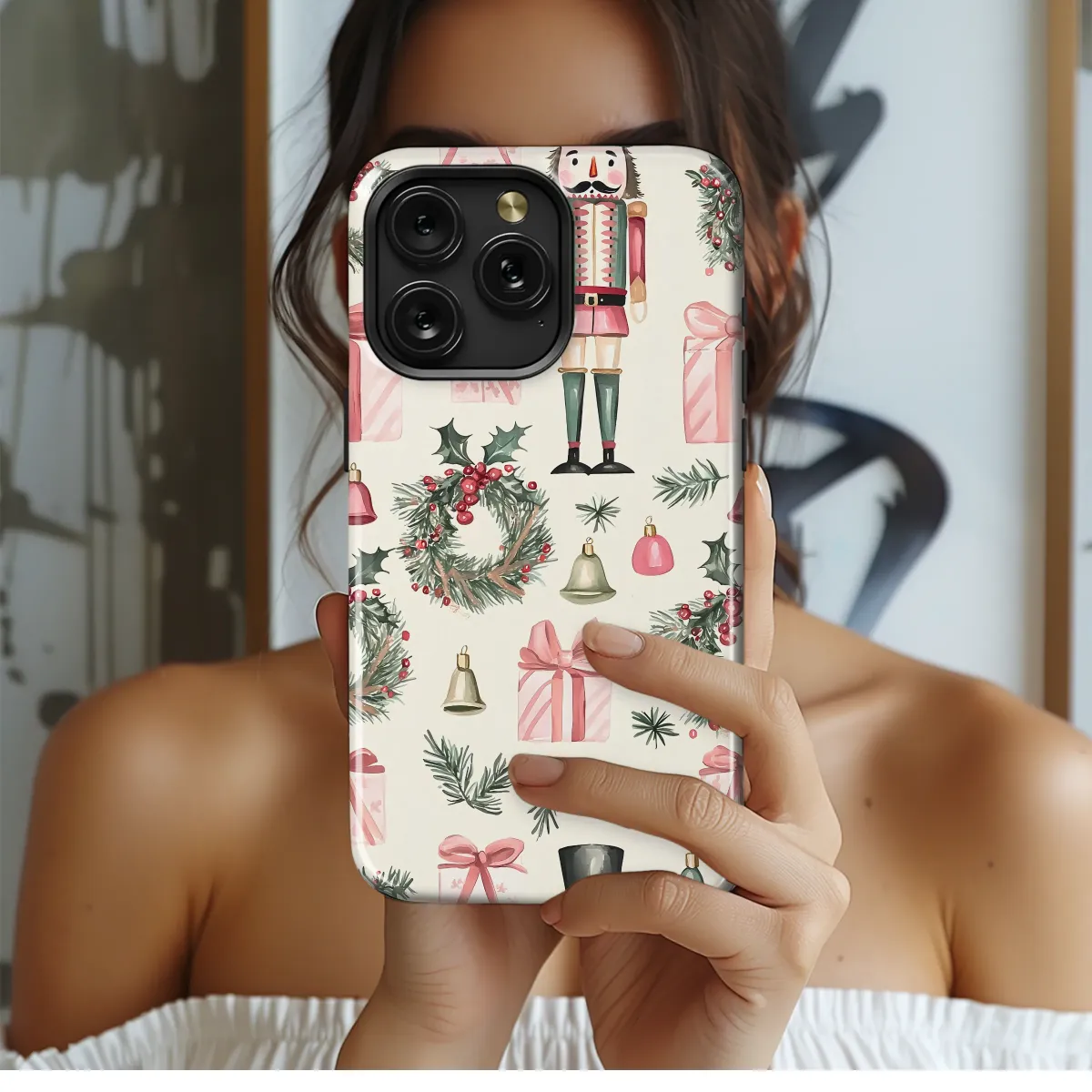 Step into a world of holiday enchantment with this timeless design, where classic Christmas magic comes to life in a delicate watercolor dream. Each detail is lovingly painted to capture the nostalgic charm of the season, from the stoic Nutcracker standing guard in his festive uniform to the beautifully wrapped pink presents tied with silken bows, each one holding a secret promise of joy. Sprigs of fresh pine and festive holly wreaths, studded with bright red berries, are scattered artfully across a warm cream canvas, evoking the crisp scent of a winter forest and the comfort of home. The gentle, silent jingle of holiday bells adds a whimsical touch, completing this symphony of yuletide spirit. This beautiful artwork, rendered in soft, muted tones of blush pink, forest green, and rich crimson, celebrates cherished traditions and the simple elegance of the holidays. Let this miniature masterpiece adorn your most essential daily companion, enveloping it in the cozy, heartwarming spirit of the season. It’s more than just a pattern; it’s a portable storybook of Christmas cheer, a perfect artistic gift for a loved one, or a festive treat for yourself to keep the magic of winter close at hand.