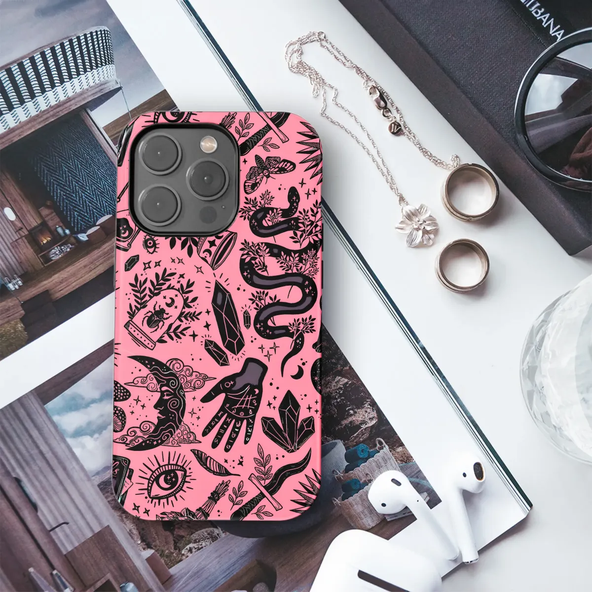 Embrace your inner mystic and surround yourself with the potent energy of this captivating design, a vibrant tapestry of magic and mystery woven onto a striking pink canvas. Each symbol is a whisper from an enchanted world, a celebration of the occult and the celestial. Let your gaze wander over the intricate, hand-drawn style details: the all-seeing eye that guards ancient secrets, the powerful serpent entwined with night-blooming botanicals, and shimmering crystals pulsing with raw energy. Discover a palmistry hand ready to divine the future, a mysterious black cat, and a spellbook filled with untold secrets. This isn't just an accessory; it's a personal grimoire, a portable altar that channels the energy of modern witchcraft and spiritual exploration. Carry the power of mystical toadstools, the fleeting time in a cosmic hourglass, and the guidance of the stars with you every day. This beautiful artwork is perfect for anyone drawn to the witchy aesthetic, seeking a unique piece of goth or boho decor, or looking for the perfect gift for the astrology and tarot lover in their life. Let this design be your daily talisman, a bold declaration of your connection to the magical and the unseen, transforming your everyday essential into a beautiful and powerful statement piece.