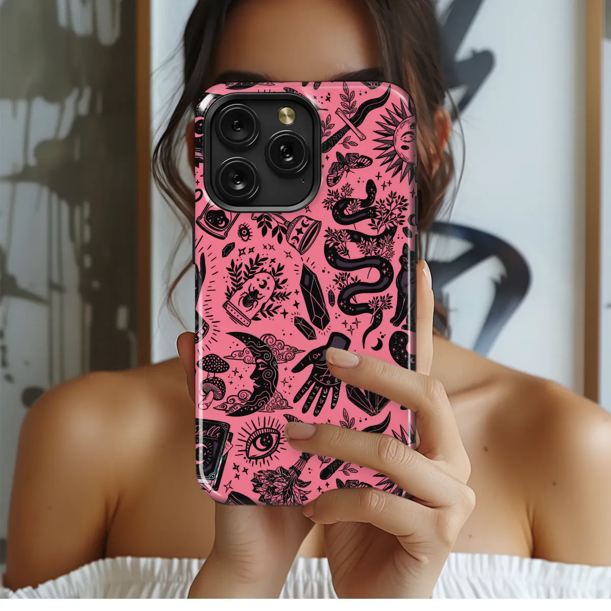 Embrace your inner mystic and surround yourself with the potent energy of this captivating design, a vibrant tapestry of magic and mystery woven onto a striking pink canvas. Each symbol is a whisper from an enchanted world, a celebration of the occult and the celestial. Let your gaze wander over the intricate, hand-drawn style details: the all-seeing eye that guards ancient secrets, the powerful serpent entwined with night-blooming botanicals, and shimmering crystals pulsing with raw energy. Discover a palmistry hand ready to divine the future, a mysterious black cat, and a spellbook filled with untold secrets. This isn't just an accessory; it's a personal grimoire, a portable altar that channels the energy of modern witchcraft and spiritual exploration. Carry the power of mystical toadstools, the fleeting time in a cosmic hourglass, and the guidance of the stars with you every day. This beautiful artwork is perfect for anyone drawn to the witchy aesthetic, seeking a unique piece of goth or boho decor, or looking for the perfect gift for the astrology and tarot lover in their life. Let this design be your daily talisman, a bold declaration of your connection to the magical and the unseen, transforming your everyday essential into a beautiful and powerful statement piece.