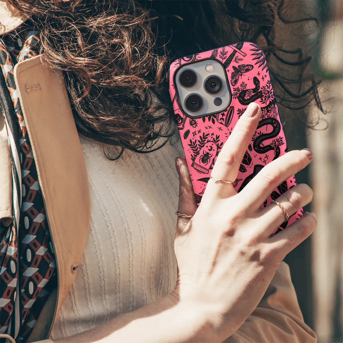 Embrace your inner mystic and surround yourself with the potent energy of this captivating design, a vibrant tapestry of magic and mystery woven onto a striking pink canvas. Each symbol is a whisper from an enchanted world, a celebration of the occult and the celestial. Let your gaze wander over the intricate, hand-drawn style details: the all-seeing eye that guards ancient secrets, the powerful serpent entwined with night-blooming botanicals, and shimmering crystals pulsing with raw energy. Discover a palmistry hand ready to divine the future, a mysterious black cat, and a spellbook filled with untold secrets. This isn't just an accessory; it's a personal grimoire, a portable altar that channels the energy of modern witchcraft and spiritual exploration. Carry the power of mystical toadstools, the fleeting time in a cosmic hourglass, and the guidance of the stars with you every day. This beautiful artwork is perfect for anyone drawn to the witchy aesthetic, seeking a unique piece of goth or boho decor, or looking for the perfect gift for the astrology and tarot lover in their life. Let this design be your daily talisman, a bold declaration of your connection to the magical and the unseen, transforming your everyday essential into a beautiful and powerful statement piece.