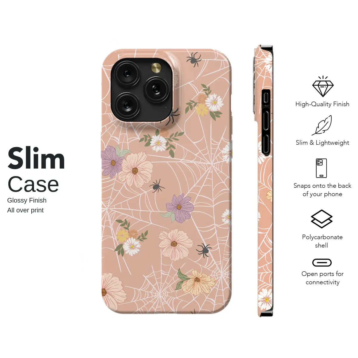 Wrap your favorite accessory in the magic of an enchanted garden where spooky season blooms all year long. This captivating design weaves an intricate tapestry of delicate, pearly-white spiderwebs across a warm, peachy-pink canvas, creating a dreamlike backdrop. Dotted amongst the elegant webs are charming little black spiders, playfully crawling between bouquets of dreamy pastel wildflowers. Imagine soft lilac, warm blush, and sunny yellow blossoms adding a touch of cottagecore sweetness to the witchy, gothic charm of the intricate webs. This unique artwork is perfect for anyone who loves a blend of the macabre and the beautiful, celebrating a soft Halloween aesthetic with a whimsical, boho twist that feels both modern and timeless. It’s a piece of art that tells a story of unexpected harmony, where nature’s delicate beauty and its mysterious side dance together in perfect synchrony. Carry this slice of a mystical, floral-spun world with you, a perfect subtle nod to autumn vibes or for adding a touch of pastel goth elegance to your everyday style. Let this design be your personal talisman, a beautiful and protective web of art that captures glances, sparks conversations, and showcases your love for all things uniquely enchanting and artistically inspired. It's more than a pattern; it's a mood, a statement, and a small piece of wearable art.