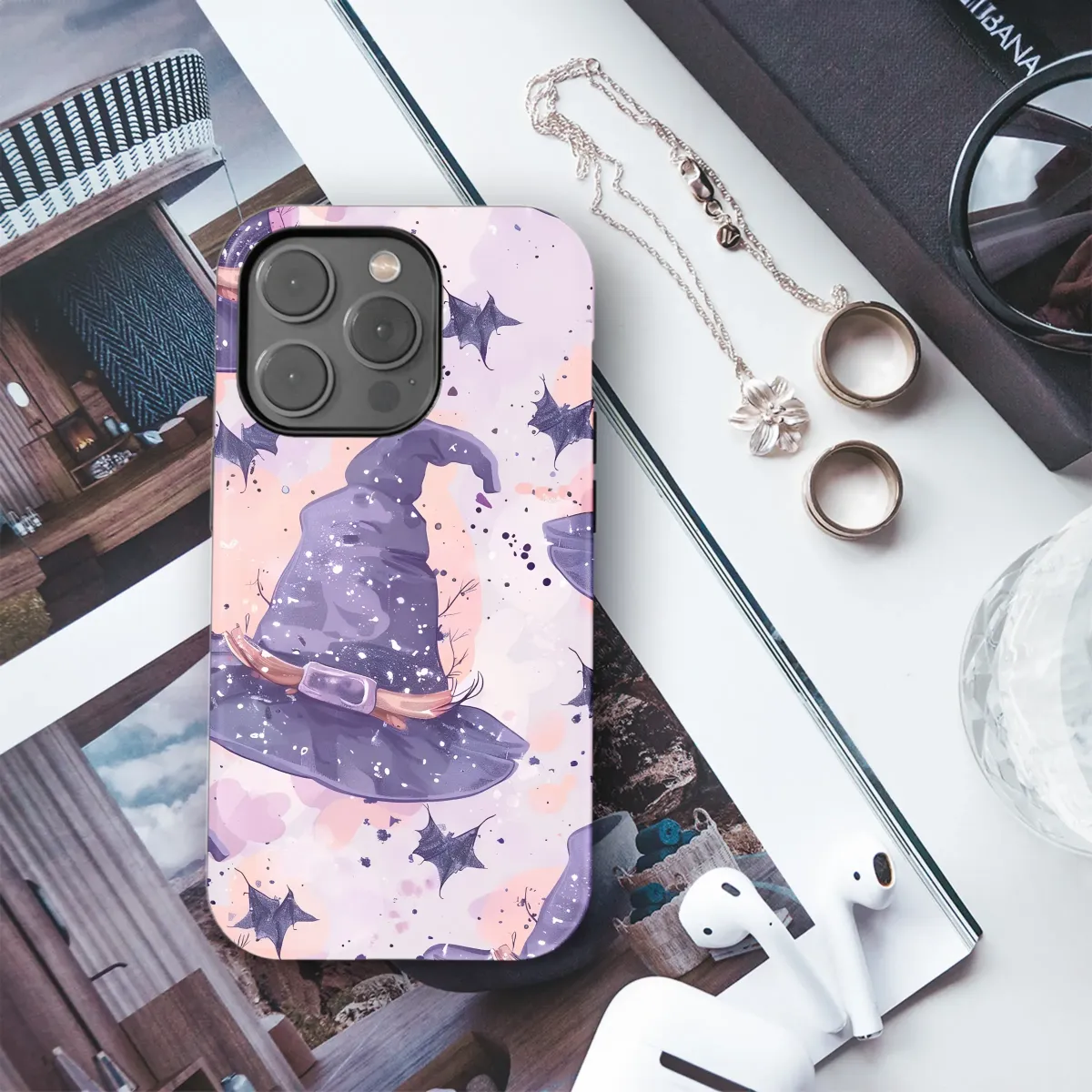 Step into a world of gentle magic with this enchanting artwork, where the veil between worlds is thin and the air is filled with cozy enchantment. Imagine a dreamy twilight sky painted in soft, swirling hues of lavender, blush pink, and deep amethyst. Floating through this mystical canvas are whimsical witch hats, each one dusted with a sprinkle of celestial stardust and adorned with rustic, earthy details. Tiny, charming bats flutter playfully between the hats, their dark silhouettes a perfect contrast against the pastel clouds. The scene is alive with movement, from the gentle drift of the hats to the delicate splatters of ink that feel like whispers of a freshly cast spell. This design captures the heart of the cozy spooky season, blending a cute Halloween aesthetic with a touch of cottagecore charm and pastel goth sensibility. It’s not about frights, but about the quiet, personal magic of an autumn evening, the rustle of turning pages in a spellbook, and the warmth of a favorite potion. It’s the perfect piece for the modern witch, the fantasy art lover, or anyone who believes in carrying a little piece of everyday magic with them. Let this spellbinding pattern wrap your favorite accessory in the charm of a whimsical witching hour.