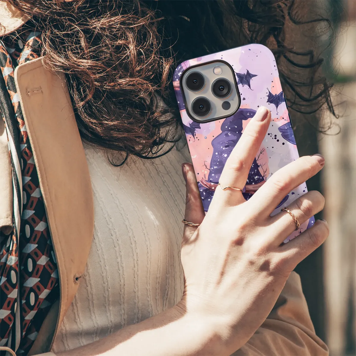 Step into a world of gentle magic with this enchanting artwork, where the veil between worlds is thin and the air is filled with cozy enchantment. Imagine a dreamy twilight sky painted in soft, swirling hues of lavender, blush pink, and deep amethyst. Floating through this mystical canvas are whimsical witch hats, each one dusted with a sprinkle of celestial stardust and adorned with rustic, earthy details. Tiny, charming bats flutter playfully between the hats, their dark silhouettes a perfect contrast against the pastel clouds. The scene is alive with movement, from the gentle drift of the hats to the delicate splatters of ink that feel like whispers of a freshly cast spell. This design captures the heart of the cozy spooky season, blending a cute Halloween aesthetic with a touch of cottagecore charm and pastel goth sensibility. It’s not about frights, but about the quiet, personal magic of an autumn evening, the rustle of turning pages in a spellbook, and the warmth of a favorite potion. It’s the perfect piece for the modern witch, the fantasy art lover, or anyone who believes in carrying a little piece of everyday magic with them. Let this spellbinding pattern wrap your favorite accessory in the charm of a whimsical witching hour.
