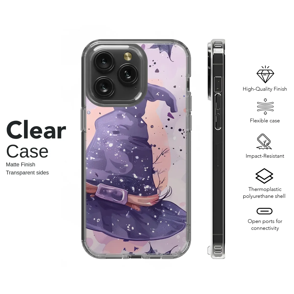 Step into a world of gentle magic with this enchanting artwork, where the veil between worlds is thin and the air is filled with cozy enchantment. Imagine a dreamy twilight sky painted in soft, swirling hues of lavender, blush pink, and deep amethyst. Floating through this mystical canvas are whimsical witch hats, each one dusted with a sprinkle of celestial stardust and adorned with rustic, earthy details. Tiny, charming bats flutter playfully between the hats, their dark silhouettes a perfect contrast against the pastel clouds. The scene is alive with movement, from the gentle drift of the hats to the delicate splatters of ink that feel like whispers of a freshly cast spell. This design captures the heart of the cozy spooky season, blending a cute Halloween aesthetic with a touch of cottagecore charm and pastel goth sensibility. It’s not about frights, but about the quiet, personal magic of an autumn evening, the rustle of turning pages in a spellbook, and the warmth of a favorite potion. It’s the perfect piece for the modern witch, the fantasy art lover, or anyone who believes in carrying a little piece of everyday magic with them. Let this spellbinding pattern wrap your favorite accessory in the charm of a whimsical witching hour.
