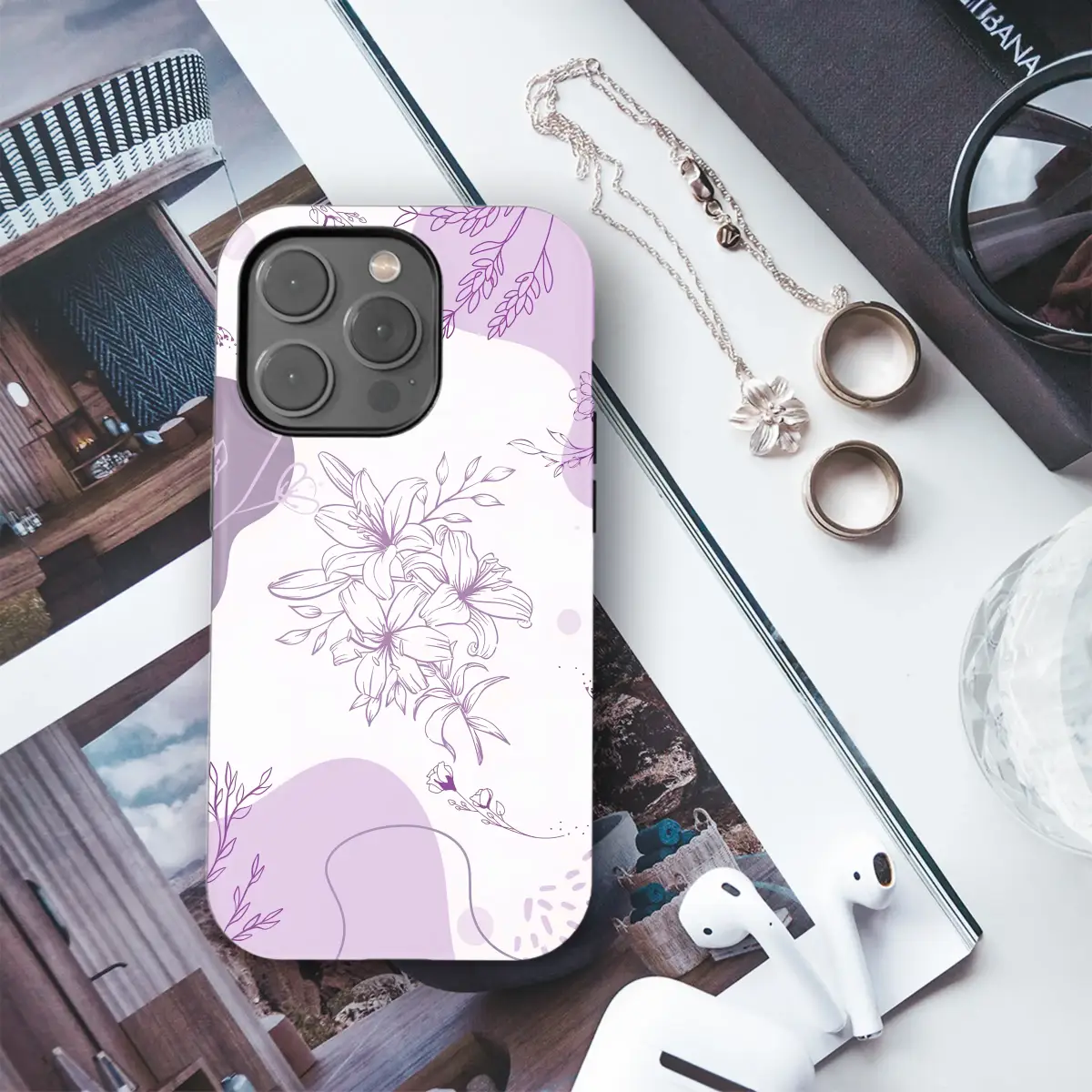 Immerse yourself in the ethereal whisper of a secret lilac garden, a design that captures the delicate balance between nature and abstract art. At its heart, a stunning bouquet of hand-drawn lilies unfolds in intricate, minimalist line art, their elegant petals a testament to timeless beauty. This central floral masterpiece floats gracefully against a dreamy backdrop of soft lavender, pale blush, and deep amethyst shapes, creating a contemporary and romantic aesthetic. Whimsical sprigs of wildflowers and gently drifting leaves seem to dance around the main arrangement, their fine lines adding a sense of serene movement and discovery. This cottagecore-inspired botanical illustration is a celebration of quiet moments and natural elegance. The monochromatic purple palette is both calming and sophisticated, perfect for anyone who appreciates a touch of feminine grace and artistic flair in their daily life. It’s more than just a pattern; it’s a wearable piece of art that transforms your most essential accessory into a statement of personal style. Carry this tranquil dreamscape with you as a daily reminder of gentle beauty and quiet strength. This unique floral line art makes a thoughtful gift for the nature lover, the dreamer, or anyone looking to infuse their world with a dose of peaceful, botanical charm.