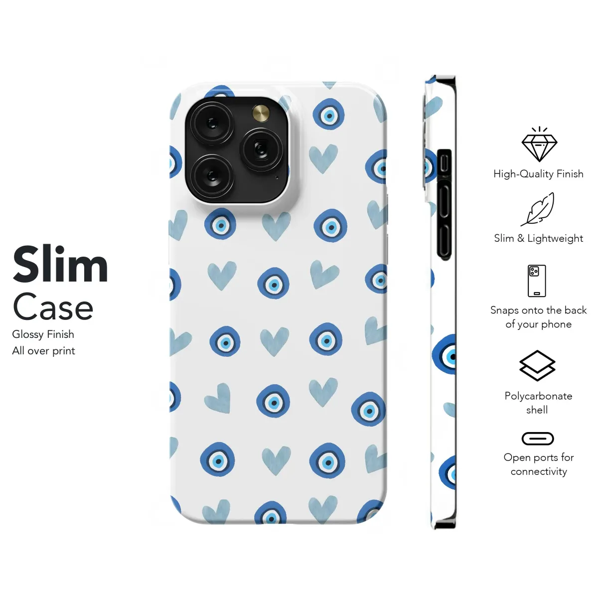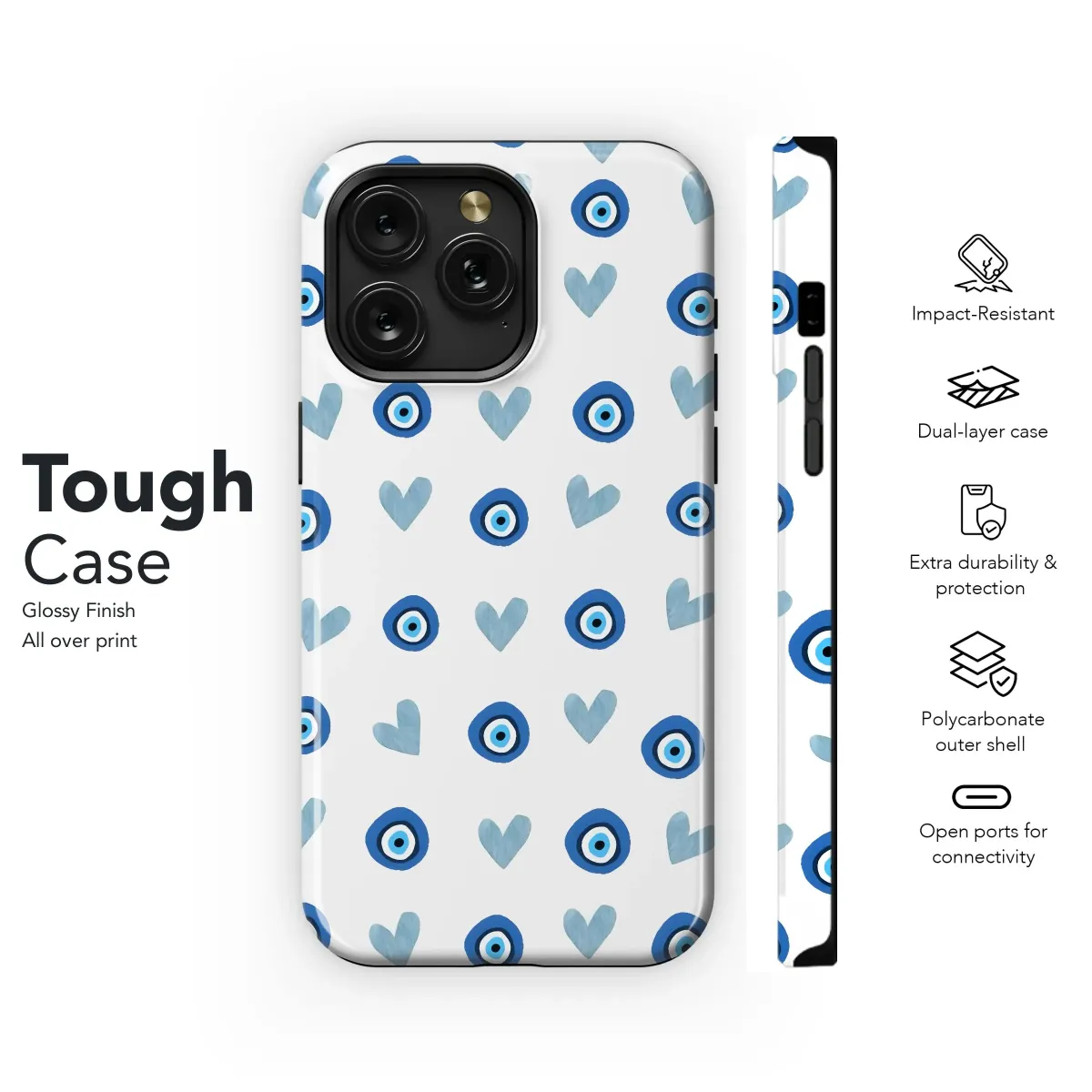 Protect your phone with this stylish case featuring an eye-catching evil eye and hearts pattern. Available for iPhone, Samsung, and Pixel models.