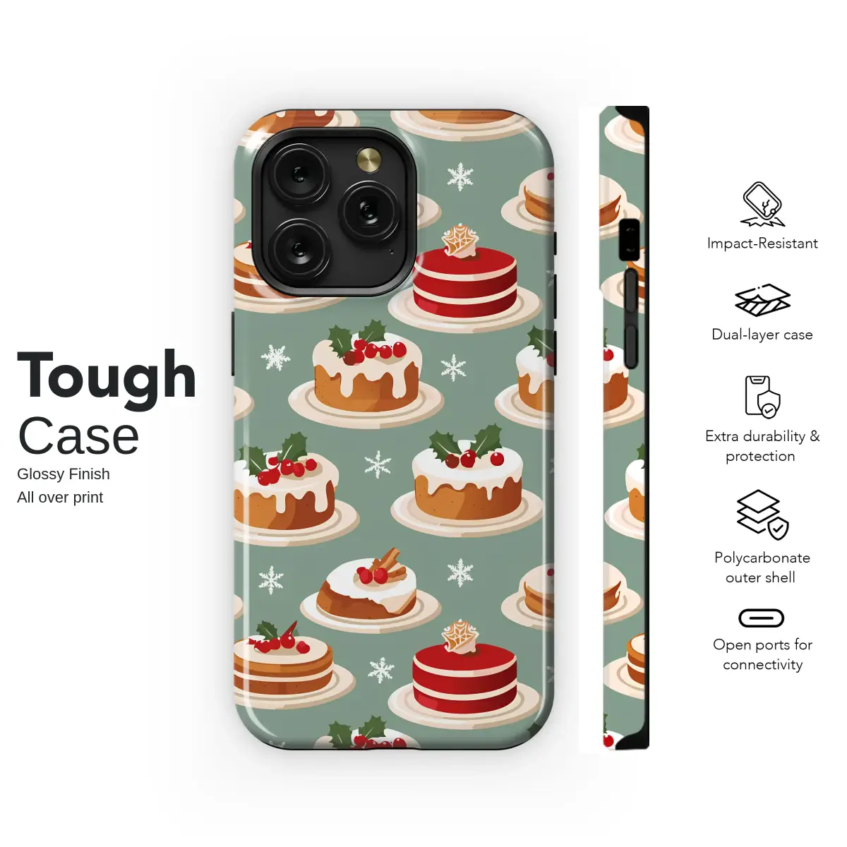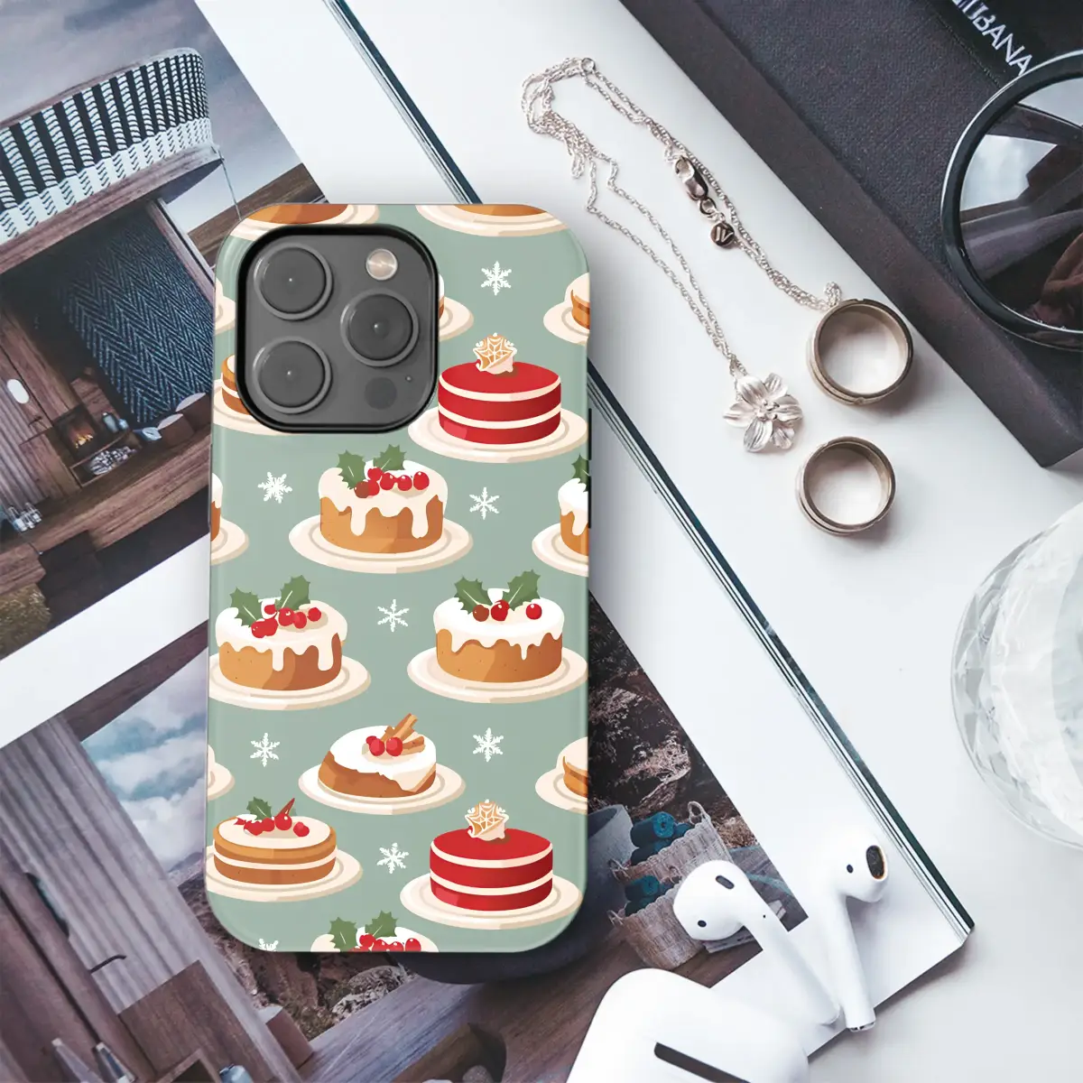 Celebrate the sweet spirit of the season with this charming holiday baking design. This delightful pattern features an array of festive desserts, including classic Christmas pudding adorned with holly, red velvet cake, and fruitcakes with cherries, all set against a sage green background with delicate snowflakes. It's a cozy and cheerful illustration perfect for any winter celebration.