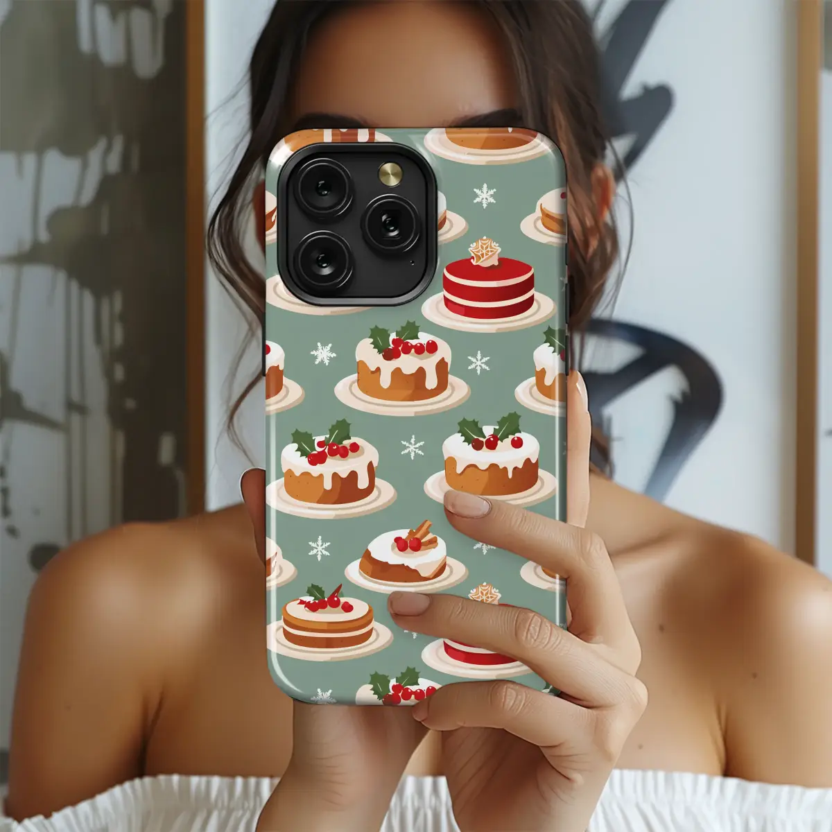 Celebrate the sweet spirit of the season with this charming holiday baking design. This delightful pattern features an array of festive desserts, including classic Christmas pudding adorned with holly, red velvet cake, and fruitcakes with cherries, all set against a sage green background with delicate snowflakes. It's a cozy and cheerful illustration perfect for any winter celebration.