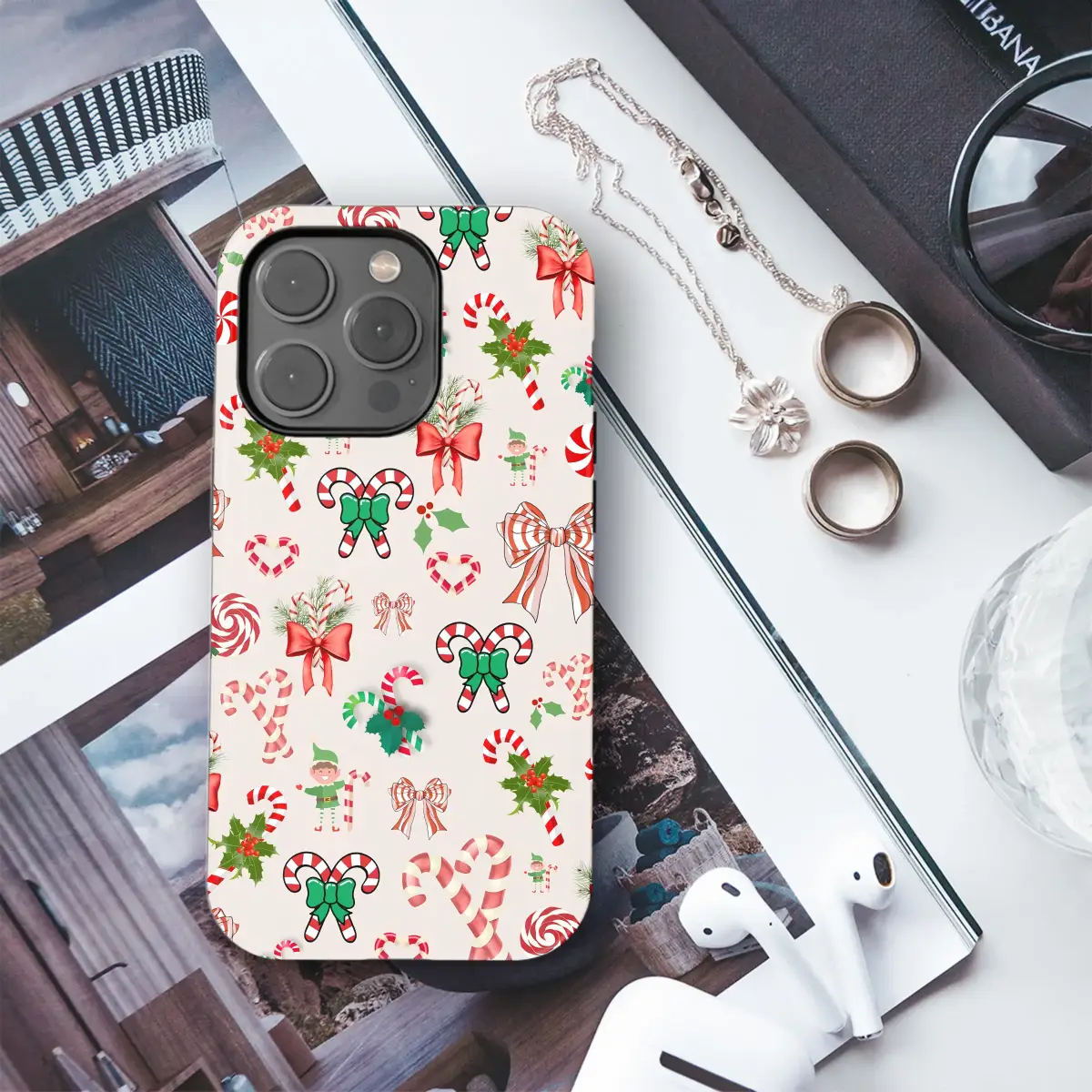 Celebrate the season with this whimsical holiday design. The festive pattern features a cheerful collection of classic Christmas icons, including sweet candy canes, joyful elves, striped bows, and holly berries. This delightful artwork captures the traditional spirit of Christmas with its vibrant red and green palette set against a soft, neutral background, creating a joyful and nostalgic feel.