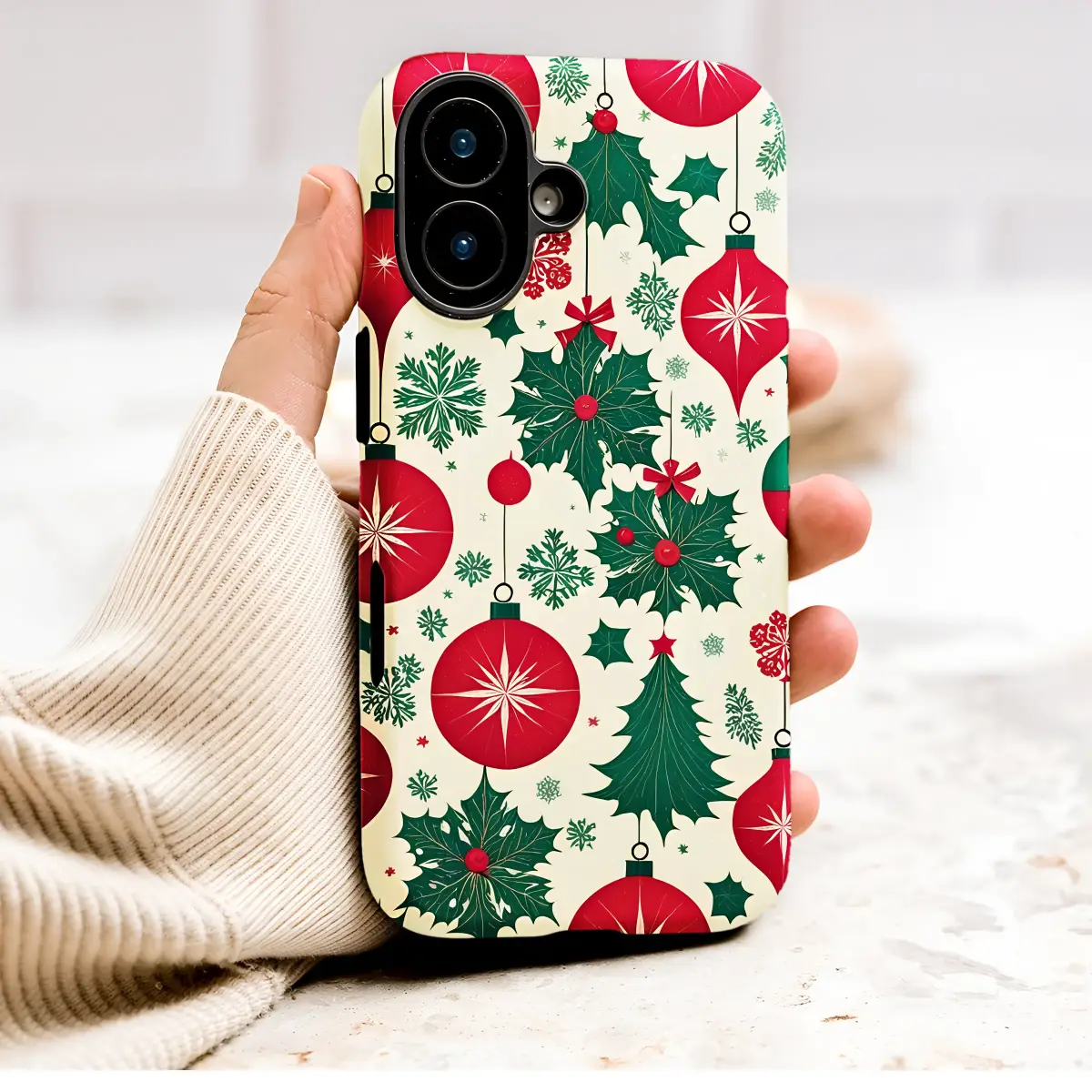 Embrace the holiday spirit with this classic Christmas pattern. The design features a delightful array of vintage-style red and green ornaments, festive holly leaves, and delicate snowflakes scattered across a cream background. This nostalgic and cheerful artwork captures the timeless joy of the season, making it a wonderful way to celebrate.