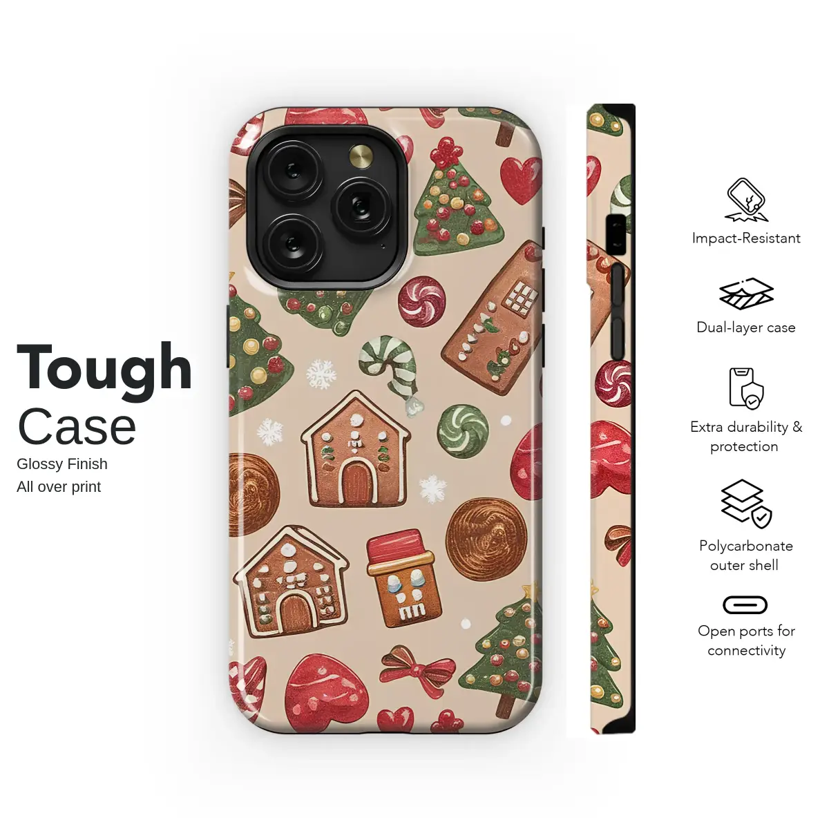 Embrace the cozy spirit of the holidays with this charming Christmas cookie design. This festive pattern features an assortment of whimsical gingerbread houses, decorated trees, sweet candies, and hearts, reminiscent of festive holiday baking. The warm, illustrative style brings a touch of nostalgic winter magic to your everyday accessory.