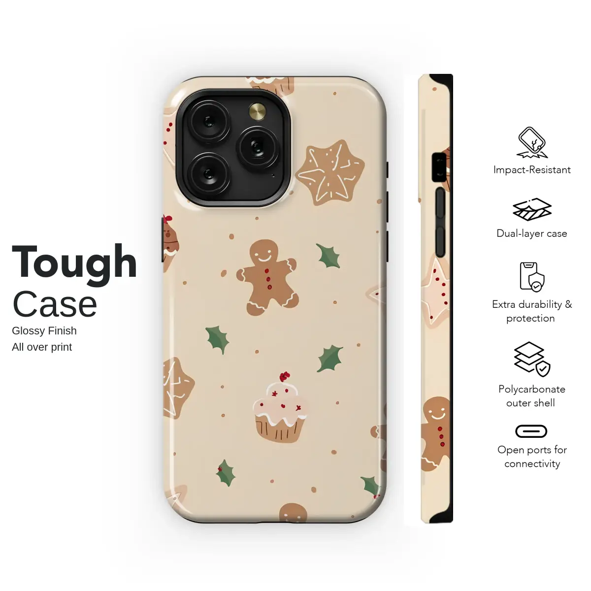 Embrace the cozy spirit of the holidays with this charming festive baking design. This delightful pattern features whimsical gingerbread men, sweet frosted star cookies, and delicious cupcakes scattered amongst sprigs of classic green holly. Set against a warm, creamy beige background, this design captures the sweet joy of Christmas baking, creating a warm and cheerful aesthetic perfect for the season.