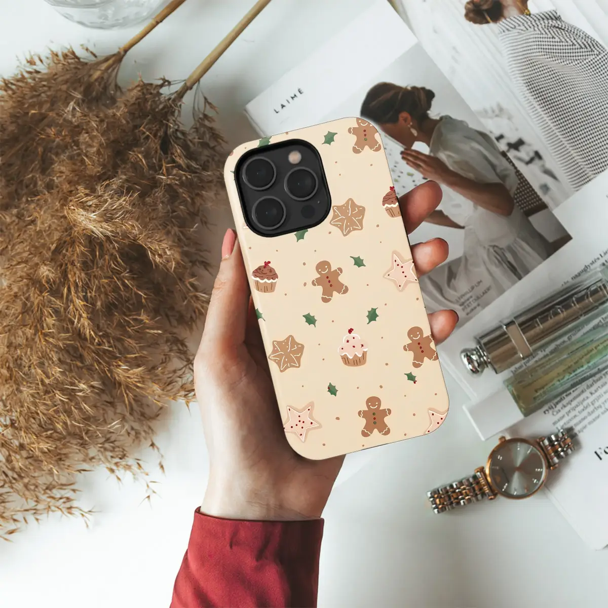 Embrace the cozy spirit of the holidays with this charming festive baking design. This delightful pattern features whimsical gingerbread men, sweet frosted star cookies, and delicious cupcakes scattered amongst sprigs of classic green holly. Set against a warm, creamy beige background, this design captures the sweet joy of Christmas baking, creating a warm and cheerful aesthetic perfect for the season.