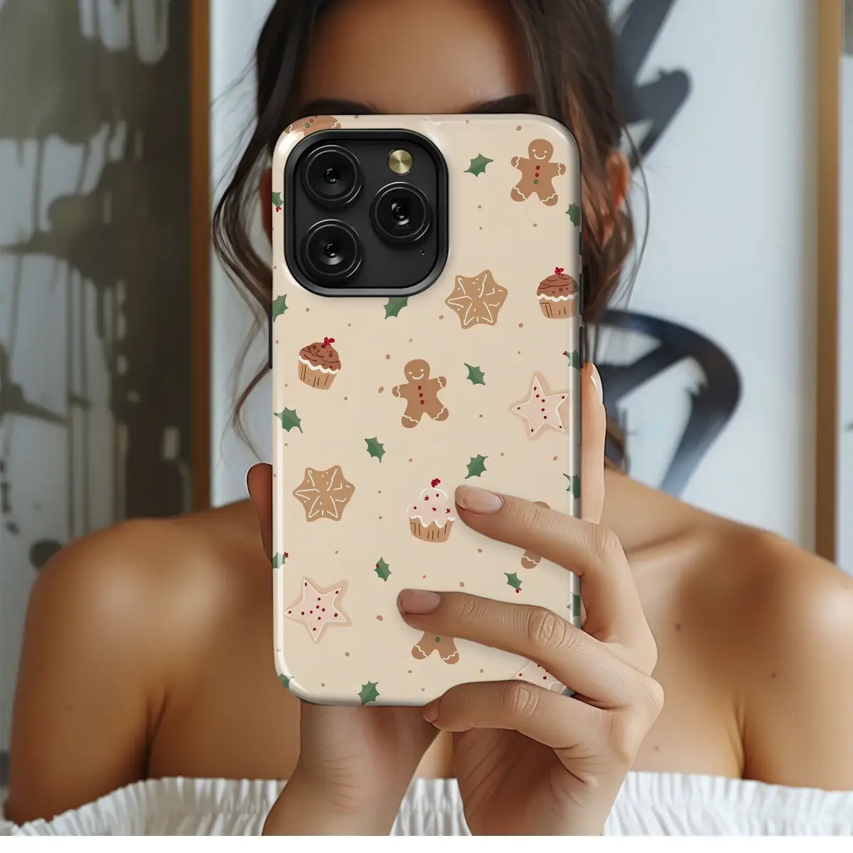 Embrace the cozy spirit of the holidays with this charming festive baking design. This delightful pattern features whimsical gingerbread men, sweet frosted star cookies, and delicious cupcakes scattered amongst sprigs of classic green holly. Set against a warm, creamy beige background, this design captures the sweet joy of Christmas baking, creating a warm and cheerful aesthetic perfect for the season.