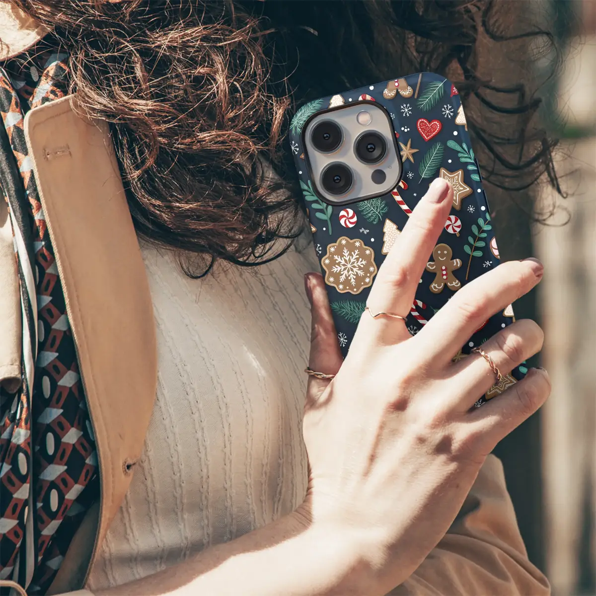 Wrap your phone in the cozy spirit of the holidays with this festive gingerbread cookie case. This charming design features a delightful pattern of Christmas cookies, candy canes, and winter greenery on a deep navy background, perfect for adding a touch of seasonal cheer. Inspired by the sweet nostalgia of holiday baking, this case brings the warmth and joy of gingerbread treats right to your fingertips. It’s a wonderful way to celebrate the season or a thoughtful gift for the baker in your life. Key Features: • Materials: Made from durable, flexible, and shock-absorbent TPU silicone. • Protection: Slim-form design provides protection without adding bulk, with raised edges to protect the screen and camera. • Finish: A vibrant, UV-printed design with a smooth, matte finish that resists scratches and fading. • Compatibility: Available for most iPhone, Samsung Galaxy, and Google Pixel models. • Care: Simply wipe clean with a damp cloth to keep it looking fresh.