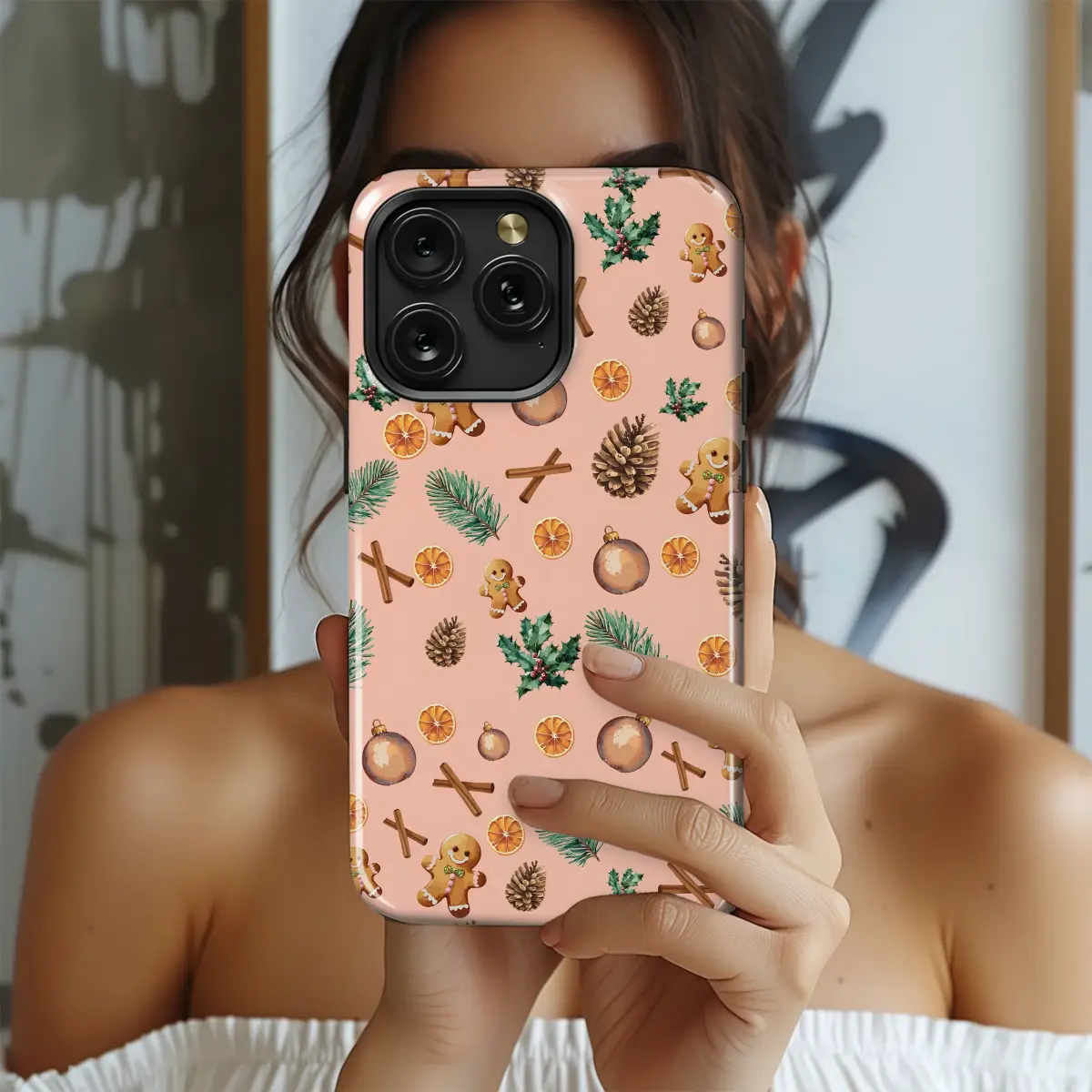 Embrace the cozy spirit of the season with this delightful holiday pattern. The design features a charming collection of winter favorites, including smiling gingerbread men, fragrant cinnamon sticks, dried orange slices, rustic pinecones, and festive holly sprigs. Set against a warm, soft background, this illustration captures the sweet and spicy essence of holiday baking and cheerful winter celebrations.