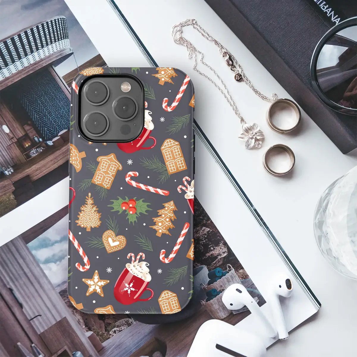 Celebrate the holiday season with this charming and festive pattern. The design is filled with classic Christmas treats, including detailed gingerbread cookies, cozy mugs of hot cocoa, sweet candy canes, and festive holly. Set against a deep, dark background, this delightful print captures the warm and joyful spirit of winter.