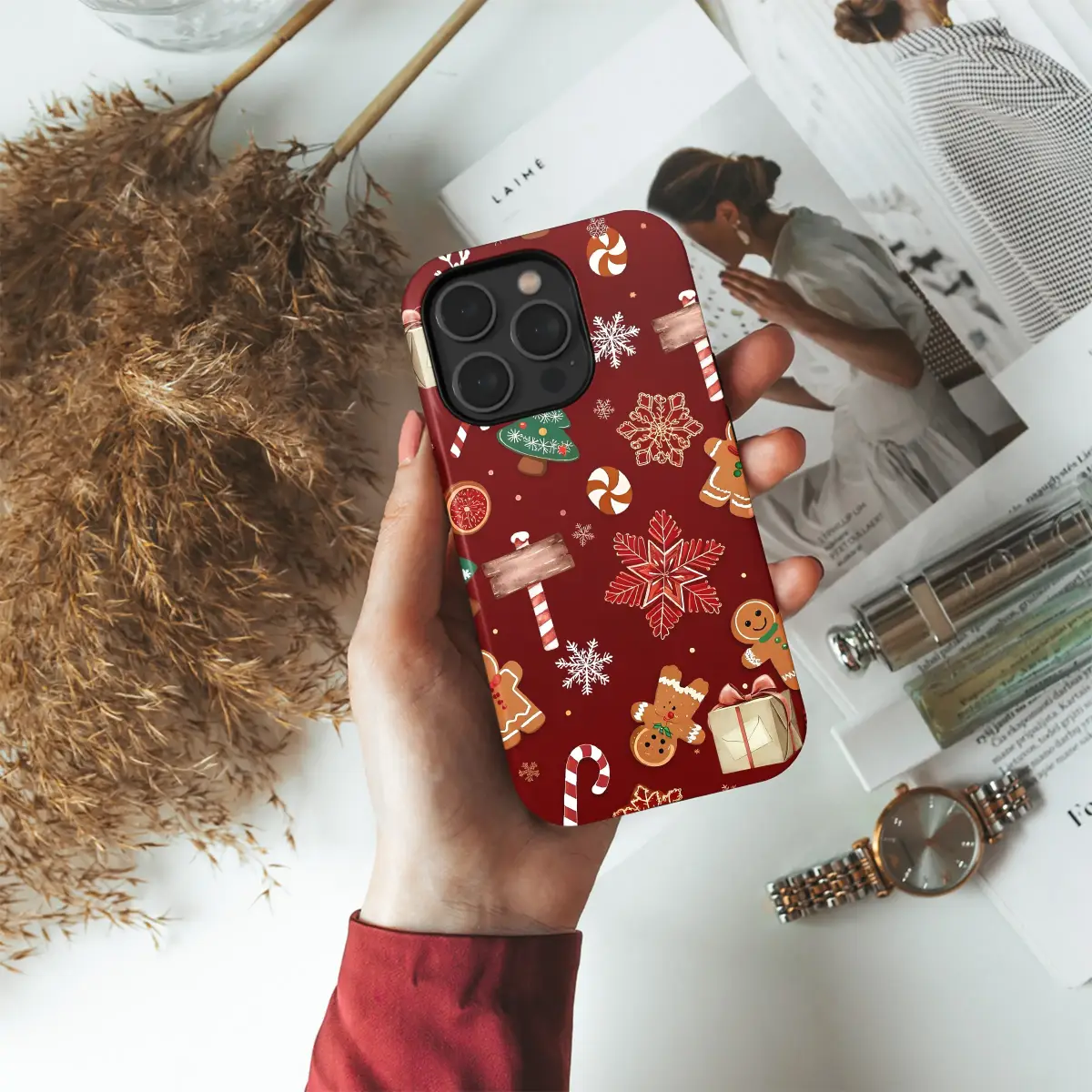 Embrace the holiday spirit with this charming and festive design. A cheerful pattern of smiling gingerbread men, classic candy canes, decorated tree cookies, and delicate snowflakes dance across a vibrant red background. This whimsical illustration captures the cozy joy of Christmas baking and winter celebrations, making it a delightful accessory for the season.