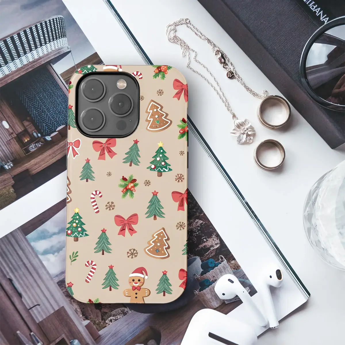 Embrace the holiday spirit with this whimsical Christmas pattern. Adorable gingerbread men, decorated evergreen trees, classic candy canes, and festive red bows are scattered across a warm, neutral background. Dainty snowflakes and sprigs of holly add a final touch of winter magic, creating a cozy and joyful design perfect for the season.