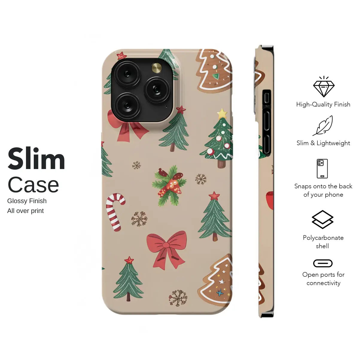 Embrace the holiday spirit with this whimsical Christmas pattern. Adorable gingerbread men, decorated evergreen trees, classic candy canes, and festive red bows are scattered across a warm, neutral background. Dainty snowflakes and sprigs of holly add a final touch of winter magic, creating a cozy and joyful design perfect for the season.
