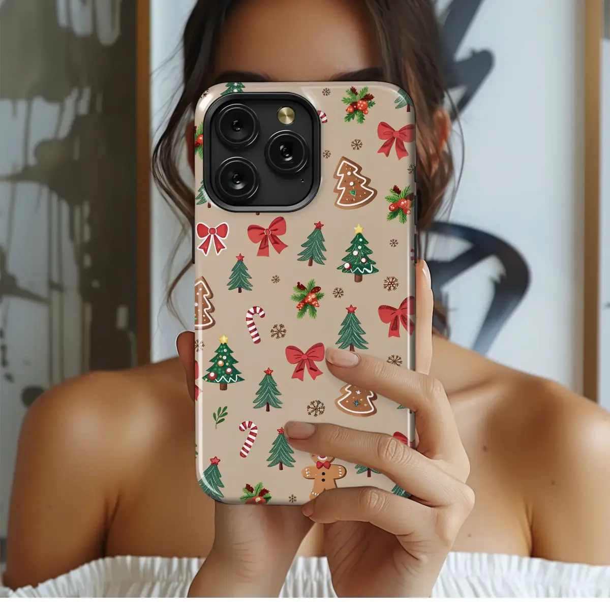Embrace the holiday spirit with this whimsical Christmas pattern. Adorable gingerbread men, decorated evergreen trees, classic candy canes, and festive red bows are scattered across a warm, neutral background. Dainty snowflakes and sprigs of holly add a final touch of winter magic, creating a cozy and joyful design perfect for the season.