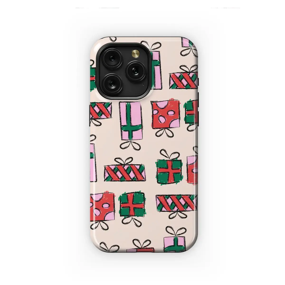 Embrace the holiday spirit with this charming pattern of hand-drawn gift boxes. Rendered in a whimsical crayon-sketch style, the design features an array of presents in festive red, green, and pink. Each box is uniquely wrapped with polka dots, stripes, or simple ribbons, creating a playful and celebratory look against a soft cream background.