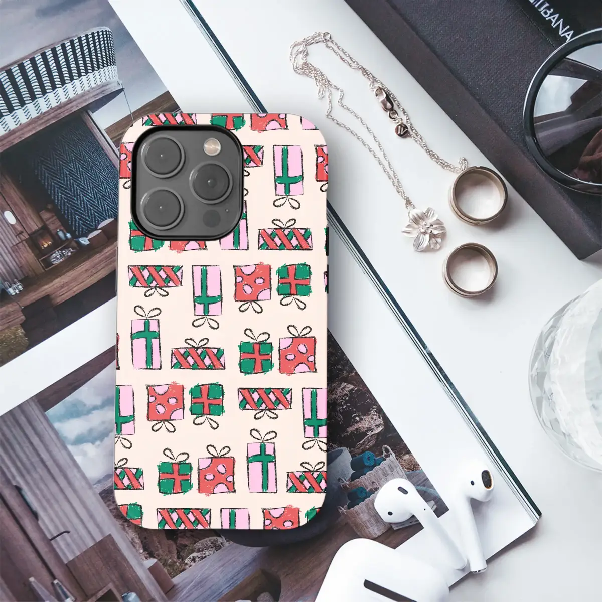Embrace the holiday spirit with this charming pattern of hand-drawn gift boxes. Rendered in a whimsical crayon-sketch style, the design features an array of presents in festive red, green, and pink. Each box is uniquely wrapped with polka dots, stripes, or simple ribbons, creating a playful and celebratory look against a soft cream background.