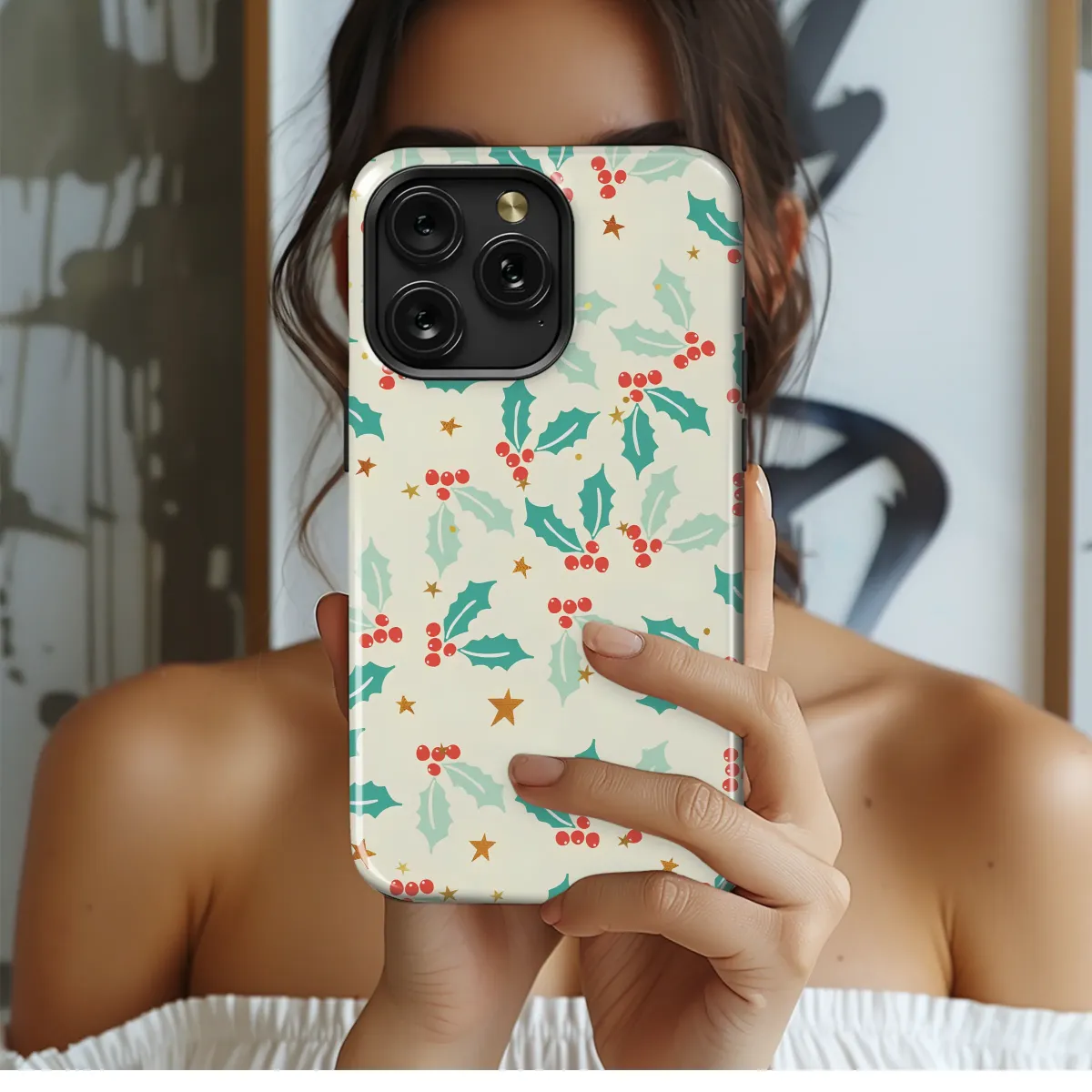 Step into a world of timeless holiday charm with this enchanting design, a beautiful tapestry of winter's most cherished symbols. Imagine crisp winter air and the joyful sound of carols as you gaze upon this delightful pattern. Sprigs of classic holly, rendered in shades of deep teal and soft mint green, dance gracefully across a warm, creamy background. Nestled among the leaves are clusters of cheerful, bright red berries, adding a pop of vibrant color and festive spirit. Tiny golden stars, some shimmering with a touch of glittery magic, are scattered throughout, like fallen stardust on a clear December night. This artwork captures the nostalgic essence of a vintage Christmas, blending traditional motifs with a fresh, modern aesthetic. It’s more than just a pattern; it’s a daily reminder of cozy moments, yuletide cheer, and the simple joys of the season. Let this lovely piece adorn your favorite accessory, bringing a sprinkle of festive elegance and heartwarming style to your everyday life. It’s the perfect way to carry the magic of Christmas with you, or to give as a thoughtful stocking stuffer to someone special who adores the most wonderful time of the year.