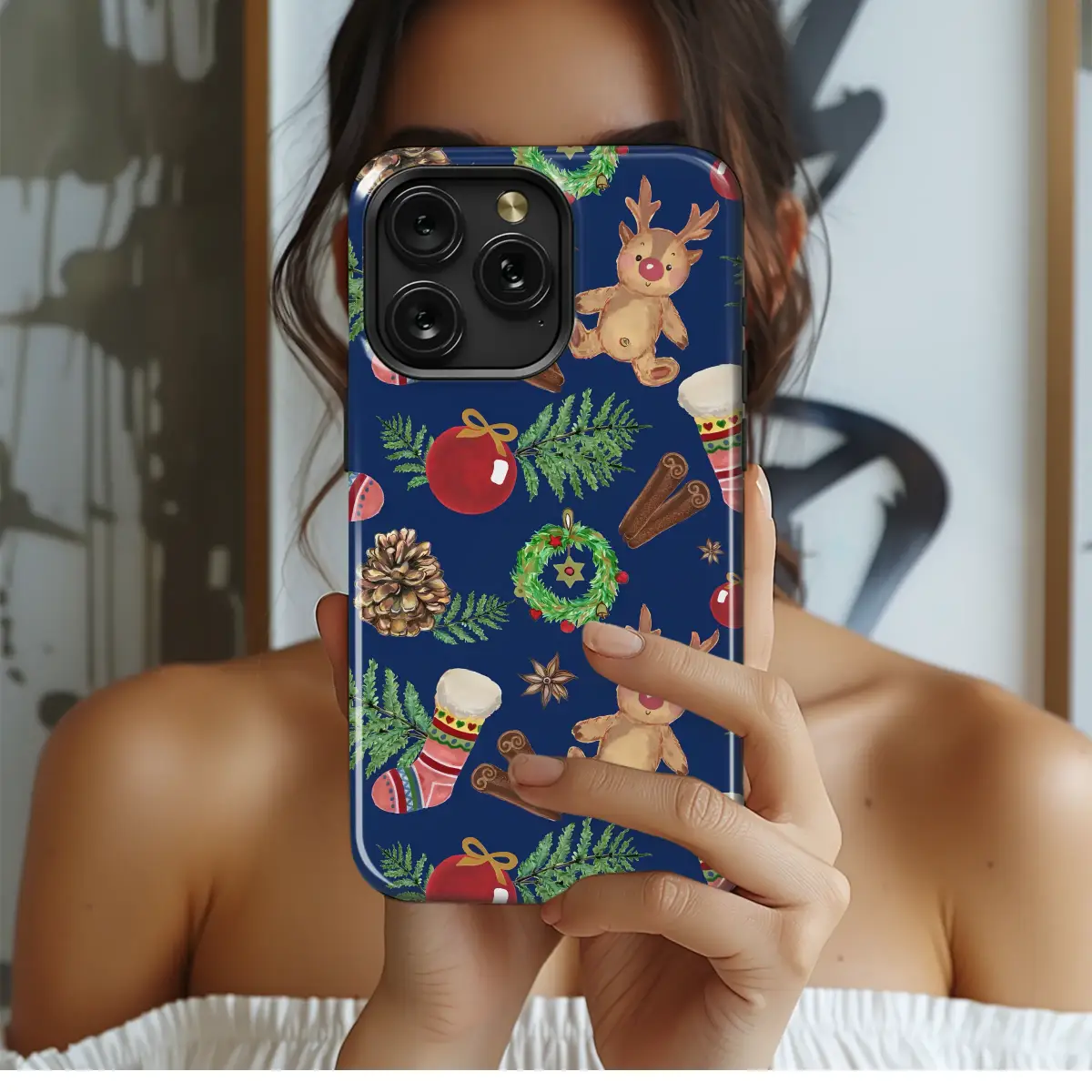 Embrace the holiday spirit with this charming Christmas pattern featuring adorable reindeer, festive stockings, and classic winter elements. The design captures the cozy essence of the season with its hand-painted watercolor aesthetic. Against a deep blue background, warm-colored reindeer, red ornaments, and patterned stockings pop, creating a joyful and traditional holiday collage.