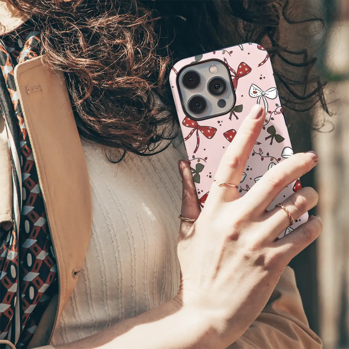 Embrace the holiday season with this whimsical Christmas pattern. The delightful design features a festive array of red, white, and green bows scattered across a soft pink background. Look closely to discover adorable snowman faces on the white bows, snowflake details on the red ones, and charming strings of colorful holiday lights twinkling throughout.