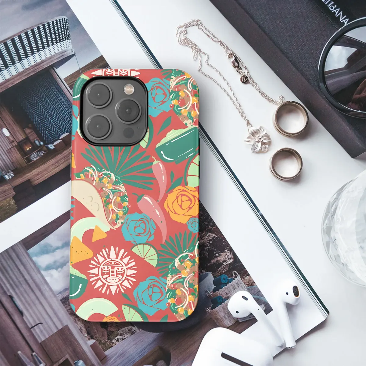 Spice up your everyday carry with this vibrant and playful design! Featuring a festive fiesta pattern, this artwork bursts with delicious tacos, creamy guacamole, zesty lime slices, and fiery chili peppers, all intertwined with colorful roses and Aztec sun symbols. The rich red background makes the other colors pop for a bold, eye-catching statement. Perfect for anyone who loves Mexican food, southwestern flair, or just wants to add a touch of fun to their tech accessories. Let this unique artwork transport you to a sunny celebration with every glance! This design also makes a great gift for taco lovers, foodies, and anyone who appreciates bright, unique art. Get yours today and show off your spicy style! Perfect gift idea for Cinco de Mayo celebration and birthday parties.