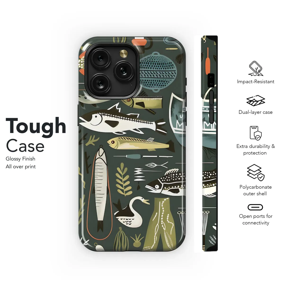 Carry your passion with you! This unique design features a charming array of stylized freshwater fish, fishing gear, and aquatic plants in a delightful Scandinavian-inspired pattern. The muted color palette of greens, browns, and oranges on a dark backdrop creates a sophisticated yet playful look. Perfect for the nature enthusiast, avid angler, or anyone who appreciates a touch of vintage charm, this eye-catching image will make your device stand out. Bring a little bit of the outdoors with you wherever you go. Great for gifts, stocking stuffer, presents. Show off your love for fishing, nature, and stylish design. Fresh Catch, fishing art, fish decor, lake life, aquatic illustration, outdoor style, retro design, modern art, art print, wall art.